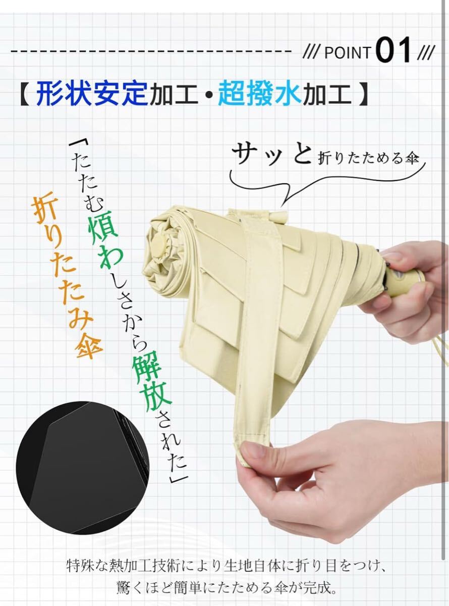 2025進化系・形状記憶加工・3秒ととのえる!】おりたたみ傘の畳みにくい難点を解消するために開発した「形状記憶加工」シリーズがついに登場しました!傘布を形状記憶加工することで、日傘を閉じた時折り目に沿ってピシッと揃えることが可能になりました。このまま留め具を閉めれば、あっという間にキレイに収納できちゃいます。非常に簡単に傘布を揃えて閉じることができるので、これまで苦手意識のあった方も使う煩わしさが軽減され、折り畳み傘をグシャグシャにたたみたくない方には特におすすめです。