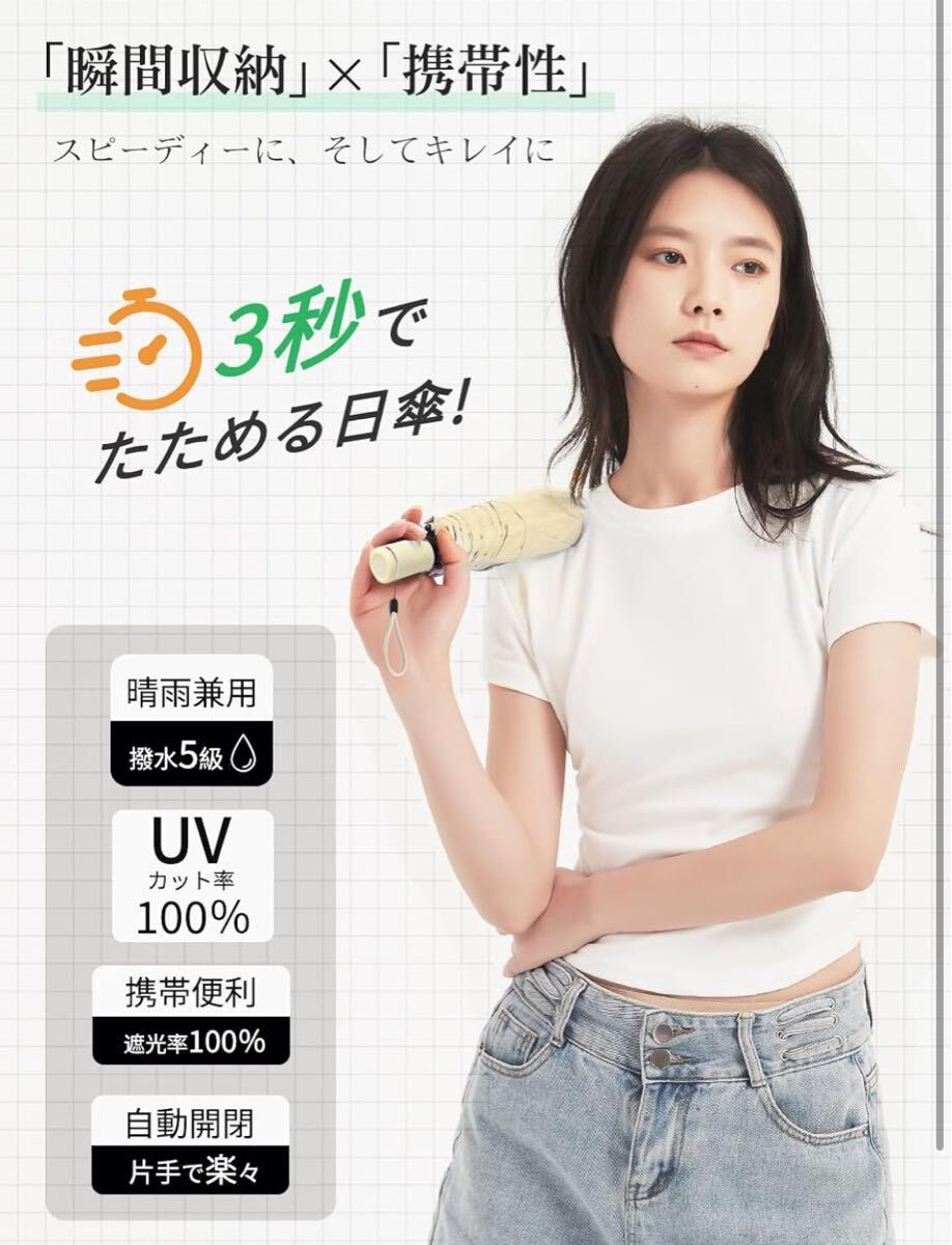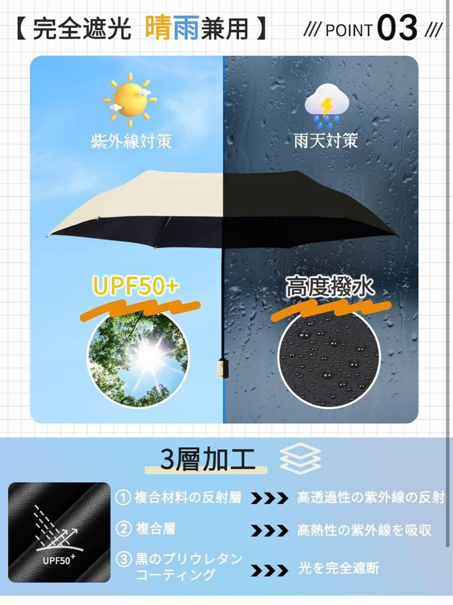【晴雨兼用・5級撥水加工】外層の傘布は防水性、疎水性、不透過性を備えナノコーティングを採用し、5級までの超撥水力を実現しました。驚くほど、雨粒を引いてくれます。最高クラスの撥水度5級をクリアしているため晴れた日の日差し対策としてはもちろん、急な雨にも対応できる撥水のテフロン加工も施されているので晴雨兼用で使用できます。