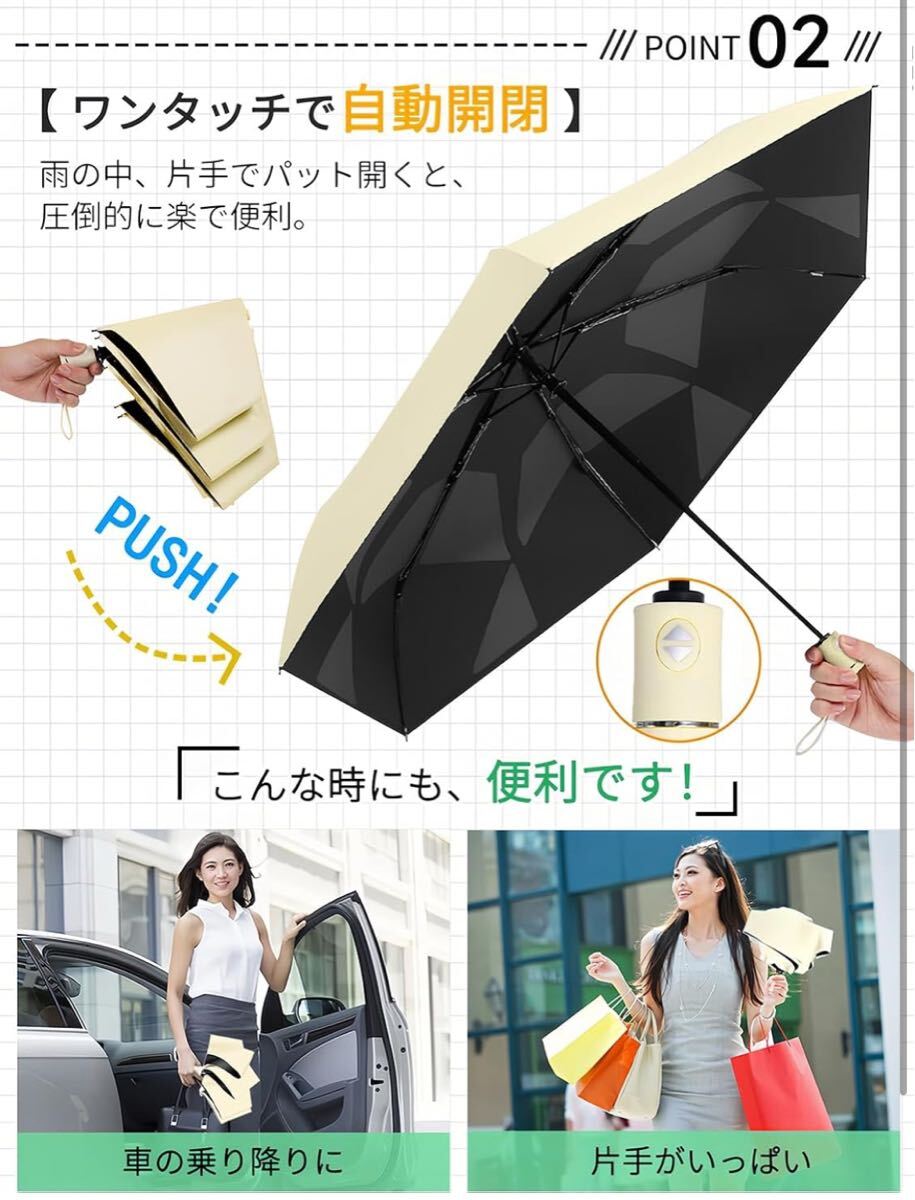 【自動開閉・片手で楽】たった3秒で折りたたみ可能で、ボタン一つで自動開閉もできます。傘を開くときは留め具のボタンを外したら傘を上へ向けてボタンを押すだけ、スムーズに素早く柄が伸びて傘がしっかり開きます。片手で傘先の金具に固定する必要がないので、荷物が多い時、降雨時に車から降りる時にもパッと開く、濡れる心配がなく、圧倒的に楽で便利です。