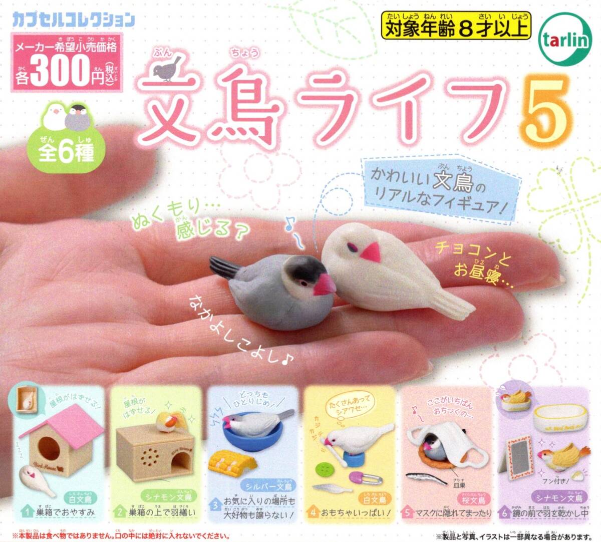 開始価格を入力されますと即落札となります。 1、巣箱でおやすみ 白文鳥 2、巣箱の羽繕い シナモン文鳥 3、お気に入りの場所も大好物も譲らない!シルバー文鳥 4、おもちゃいっぱい!白文鳥 5、マスクに隠れてまったり 桜文鳥 6、鏡の前で羽を乾かし中 シナモン文鳥 全6種セット・ミニブック付き・カプセル無しです。 |
