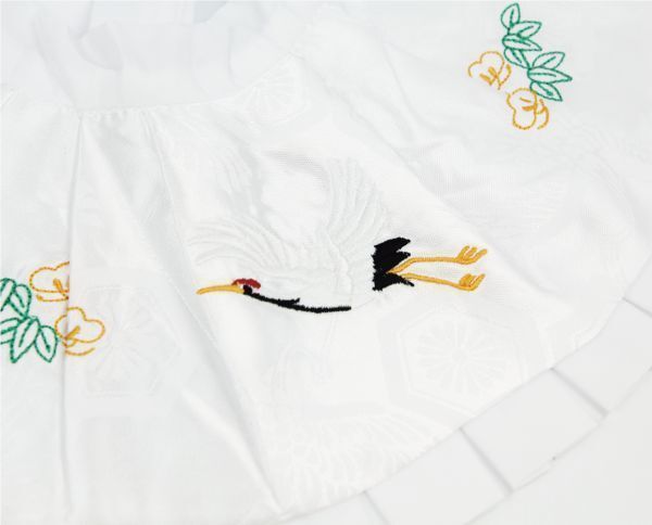 よだれかけには縁起物の鶴と松が刺繍されており、帽子にはレースがあしらってありますので非常に高級感もあります。
