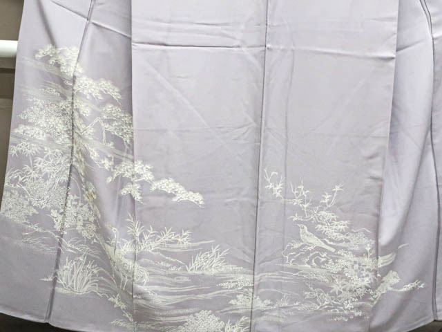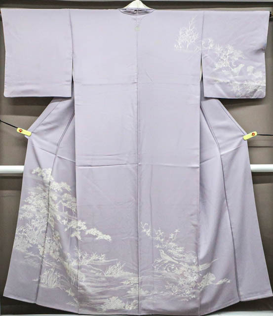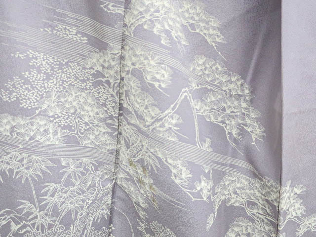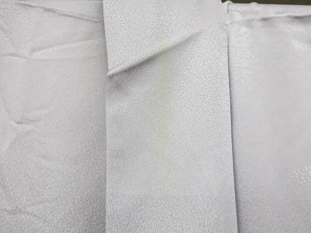 リサイクル商品のため、袖・背・胴裏シミ、衿汚れがございますがご着用いただけると存じます。 地色は薄紫です。 1枚目の画像が近いお色かと思われます。 素材は正絹です。 |