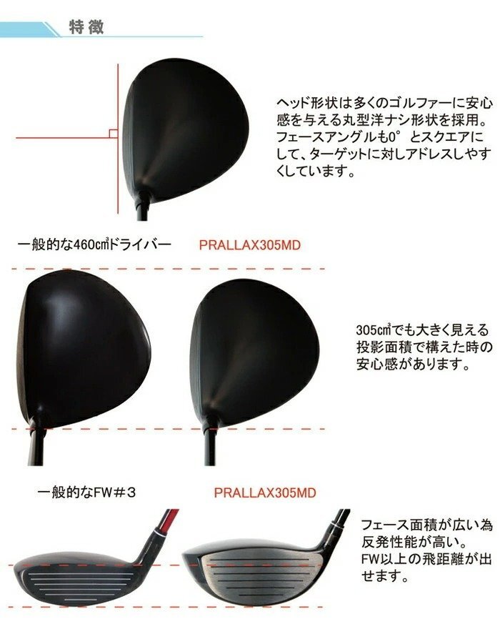 商品説明 | 操作性と飛距離性能を追求した 305cmミニドライバー「PARALLAX 305MD」(パララックス305エムディー) 最適重量設計とV3ソールデザインの効果により、ティーアップはもちろん直打ちでも圧倒的な飛距離と操作性をご体感ください。 ヘッド形状は多くのゴルファーに安心感を与える丸型洋ナシ形状を採用。 フェースアングルも0° とスクエアにして、ターゲットに対しアドレスしやすくしています。 305cmでも大きく見える投影面積で構えた時の安心感があります。 フェース面積が広い為反発性能が高い。 FW以上の飛距離が出せます。 接地面積を減らすことで芝の抵抗を軽減。 フェアウェイからの抜けを良くし、 様々なライに対応できるので直ドラ並みの飛距離を生み出します。 ウェイトスクリュー フェース寄りにウェイトを配置することで重心を浅めに設計し操作性を高めました。 直進性に優れた力強いボールを打つことが出来ます。 精密チタン鍛造製法でミニドライバー最適重心設計することにより、ドライバー並みの飛距離性能を実現しました。 パワーチューンシャフトとの相乗効果で、ゴルファ一のヘッドスピードを最大限にアップさせてインパクトするので最大飛距離を可能にしました。 PARALLAX 305MDは、ドライバーの飛距離と3番ウッドの操作性を併せ持つミニドライバーです。 |