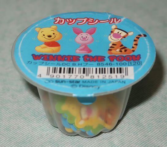 (カップにプーさん、ピグレット、ティガーのシールが入っています)