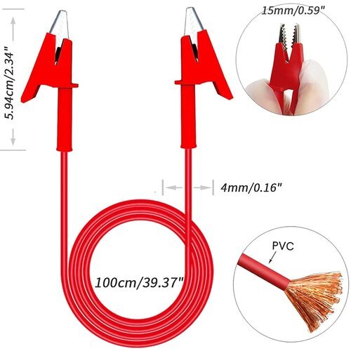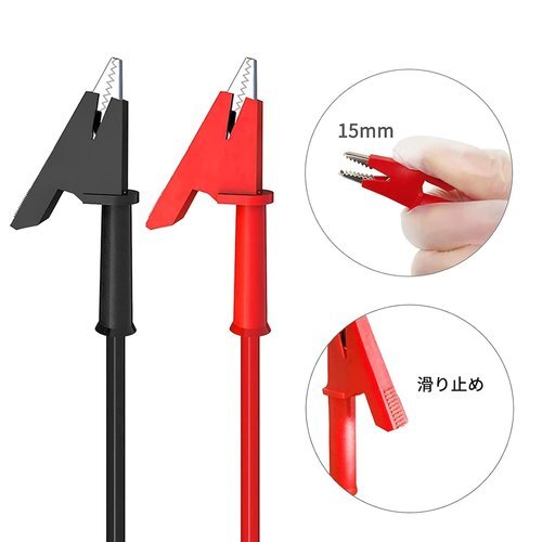 純銅製:テストリードの両端は、純銅のワニ口クリップです。クロコダイルクリップの開口部の最大幅は15mmです。リード長:1m。電圧:V。電流:15A。