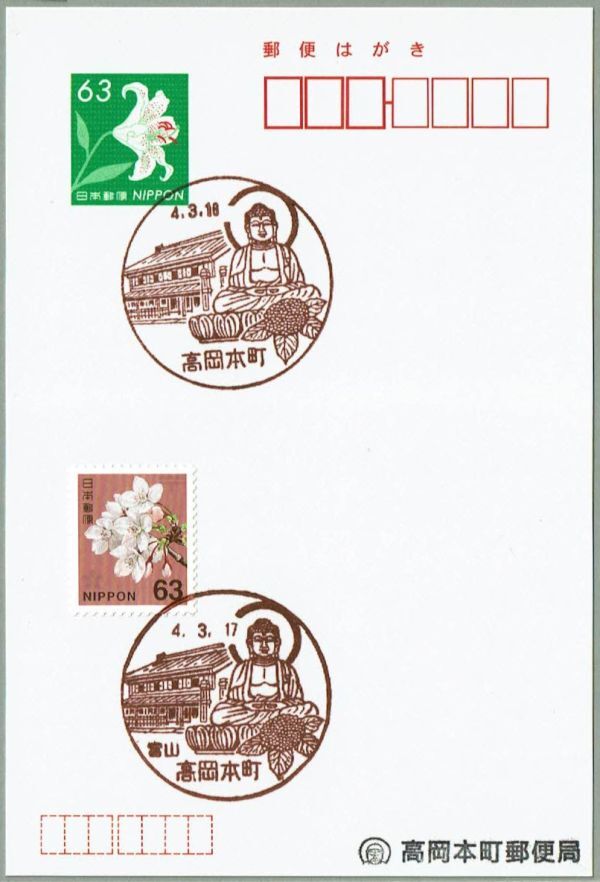 新図案の初日印を印面部分(上)に、旧図案の最終日印(3月17日)をはがきの下に63円切手を貼り押印しています。