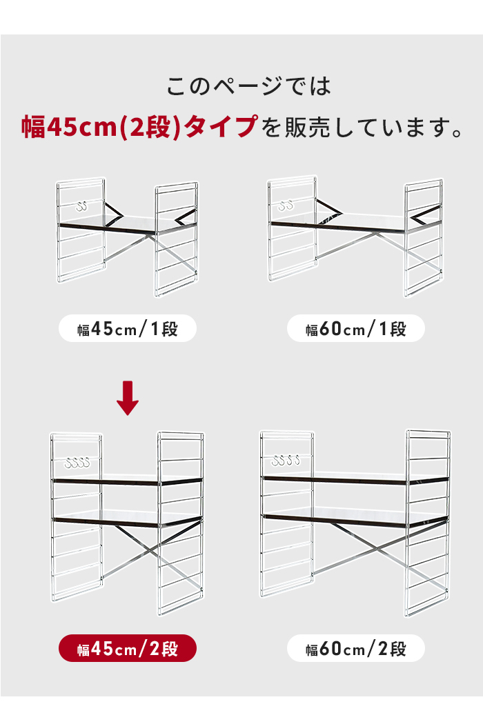 | ※【同シリーズ】のリンクは当店のヤフオク店のページへ進みます。 【ダブルフレームトースターラック】 ● 1段:幅45cm/幅60cm ● 2段:幅45cm/幅60cm ※このページは[ダブルフレームトースターラック 幅45cm・2段]を販売しております。 |