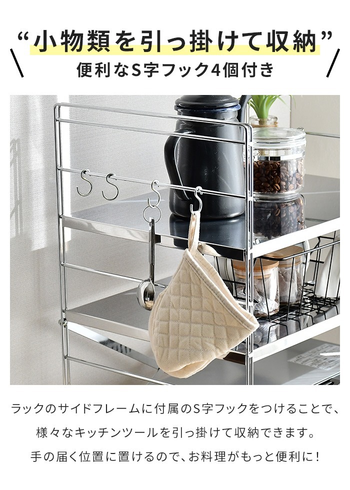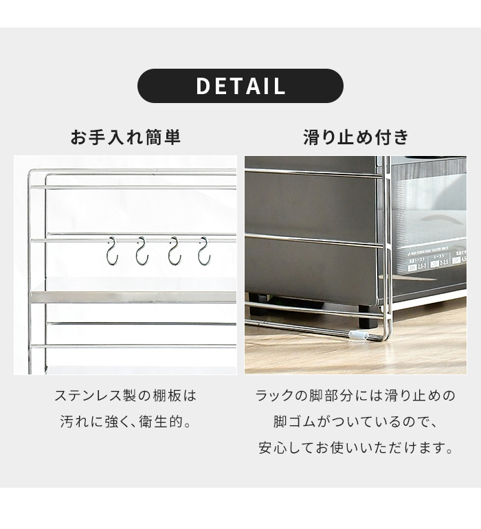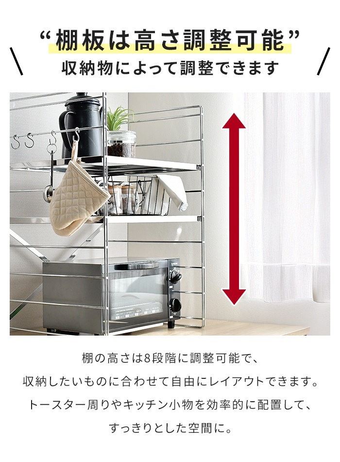 | トースター周りの空間を有効活用!キッチンの利便性を高めるスタイリッシュなラック。 棚板は耐久性に優れたステンレス製で、清潔感あふれるデザインが特徴。 棚の高さは4段階に調整可能で、トースターだけでなく電子レンジ、炊飯器などのキッチン家電を効率的に配置できます。 キチン周りのアイテムを吊り下げて収納できるS字フック付き。 安心の日本製ラック。 |