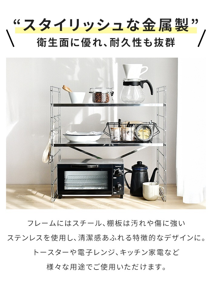 | トースター周りの空間を有効活用!キッチンの利便性を高めるスタイリッシュなラック。 棚板は耐久性に優れたステンレス製で、清潔感あふれるデザインが特徴。 棚の高さは4段階に調整可能で、トースターだけでなく電子レンジ、炊飯器などのキッチン家電を効率的に配置できます。 キチン周りのアイテムを吊り下げて収納できるS字フック付き。 安心の日本製ラック。 |