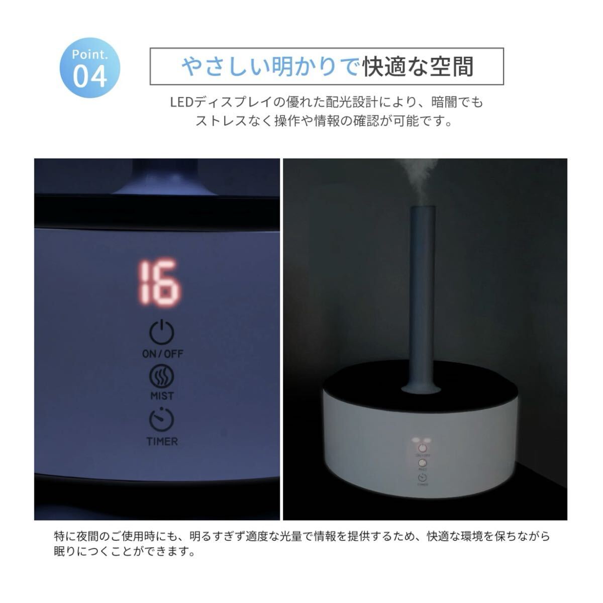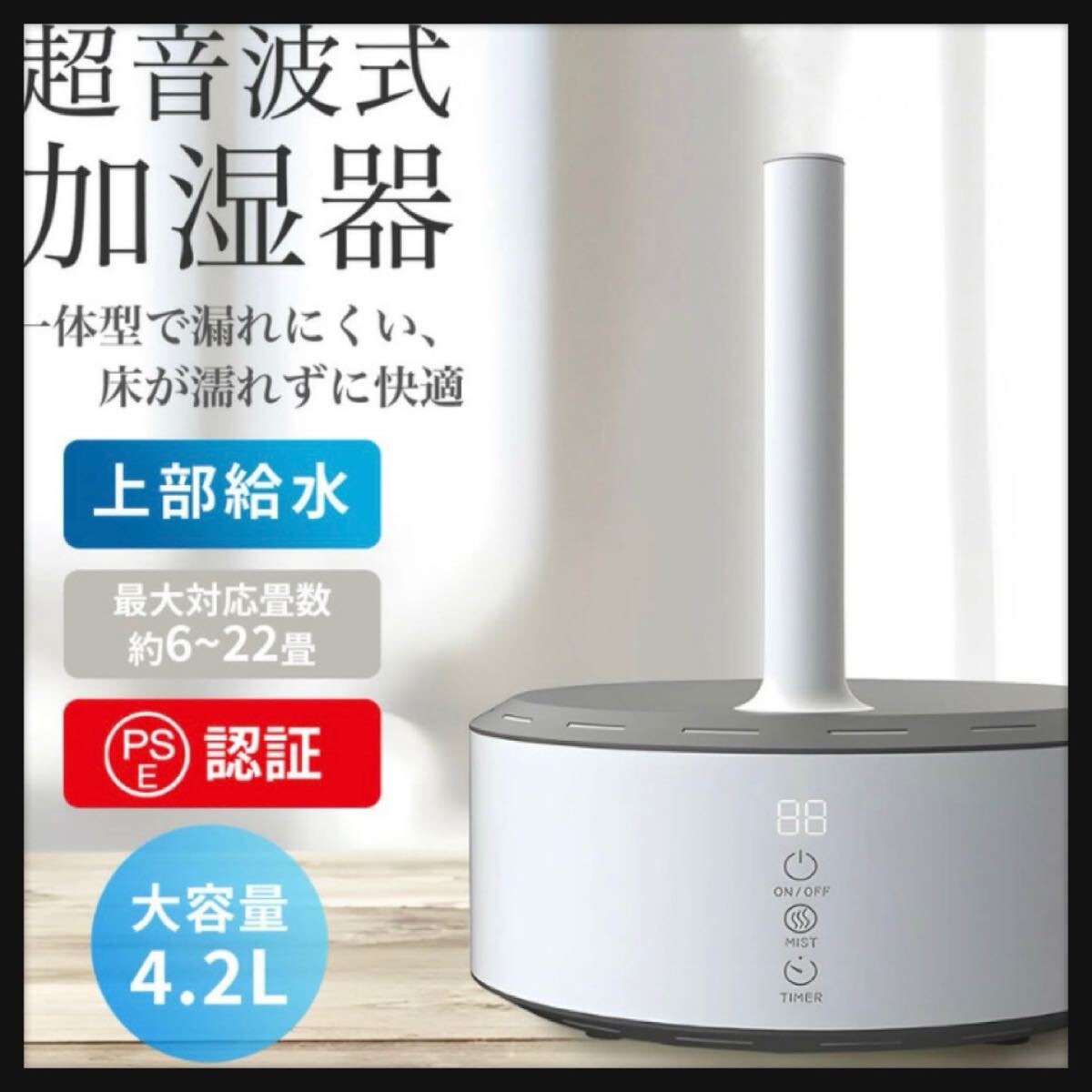 「4.2Lの大容量&乾燥対策」洗える超広口4.2リットルタンク、最大16時間の連続使用が可能です。頻繁に給水する必要はありません。1時間に約300mlのミストを拡散し、6〜22畳の空間に対応でき、リビング、寝室、ベビールーム、オフィスなどに最適です。超音波の振動で水を超微細なミストに分解して放出し、自然で快適な潤いを生み出します。また、女性に嬉しい美肌効果もあります。高いデザイン性も魅力です。鼻・のど・肌の乾燥、静電気の発生、風邪、アレルギー、喘息などの症状を抑えることができ、花粉の散布時期におすすめです。
