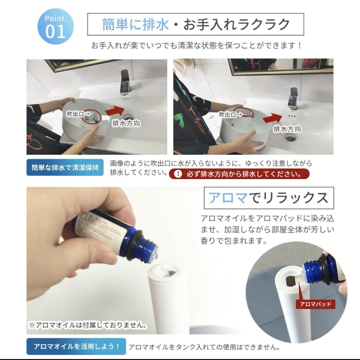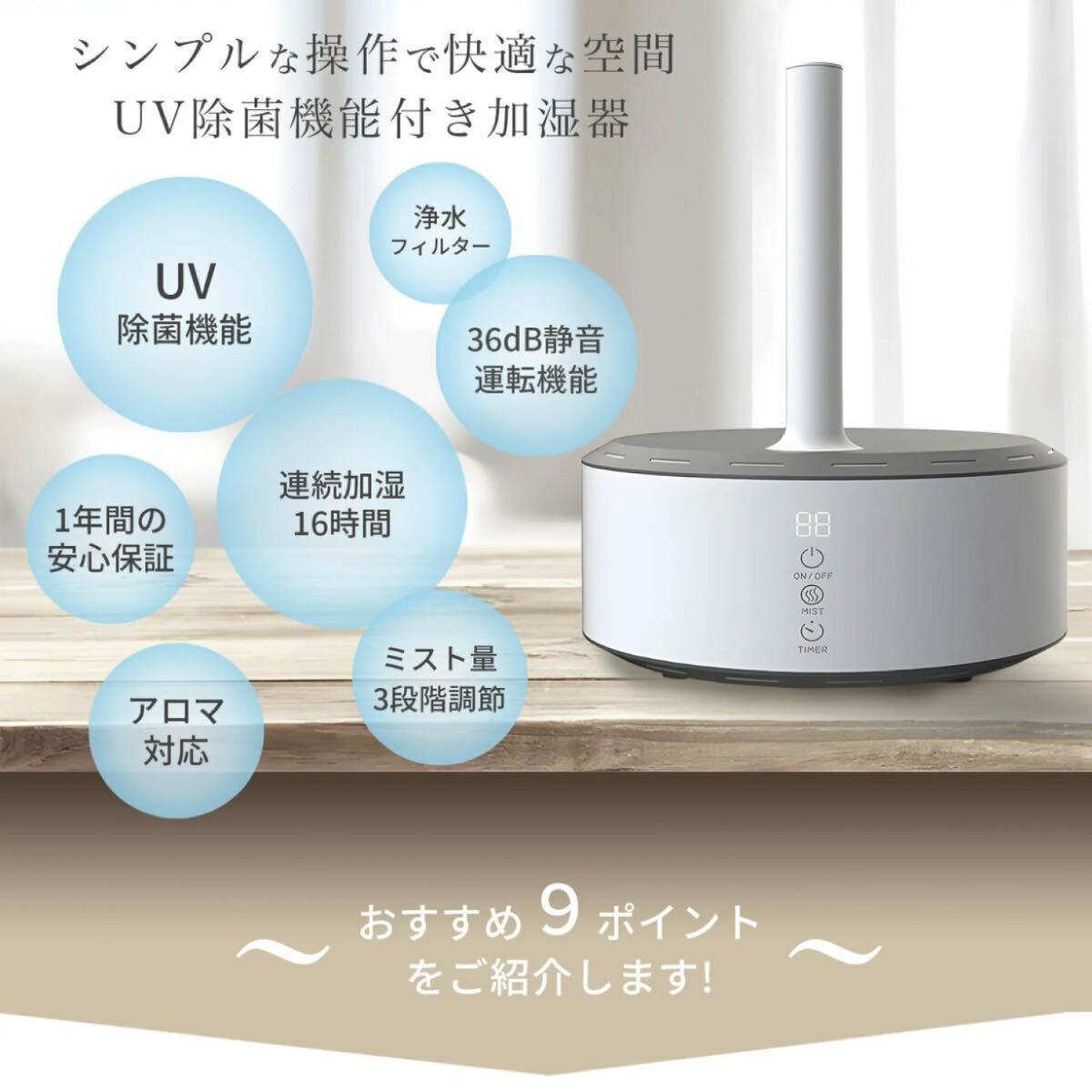 「安全安心設計&お手入れ簡単」安全性と利便性についていろいろ心配しています?その必要はありません。水タンクを持ち上げたときや、水が足りないときには、自動的に運転を停止する空焚き防止機能が付き、お子さまやお年寄りがいる家庭でも安心してご使用いただけます。水タンクについている大給水口により、お手軽に給水やお手入れをしていただけます。また、加熱式に比べて、当製品の消費電力はわずか24Wで、1時間の平均電気代は1円未満。省エネで一日中つけっぱなしでも大丈夫です。超音波式の加湿器は、水を加熱しないため、省エネ性・安全性に優れているのが魅力です。抗菌仕様のクリーンフィルター搭載のため、衛生的。省電力で済み、抗菌フィルターがタンク内部を清潔に保ちます。