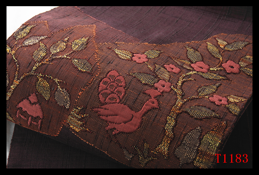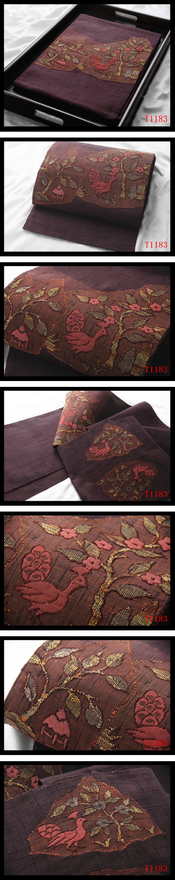 蔵【T1183】厳選美品 紬 花鳥紋 紫鳶色地 気品豊かに 正絹高級美術開き名古屋帯 ◇検簪着物袋帯和装小物帯締め