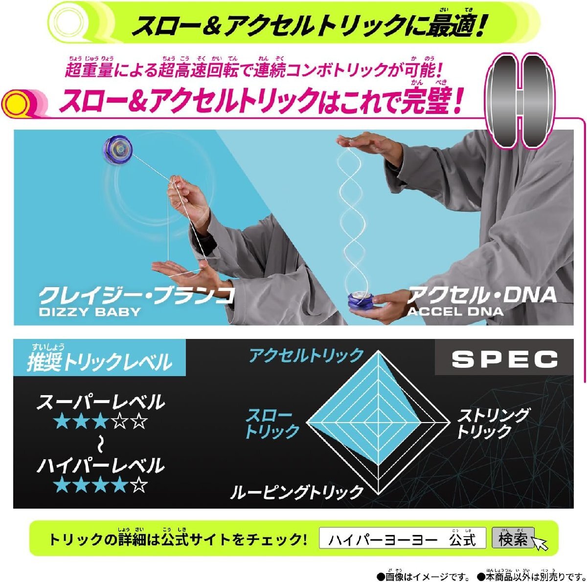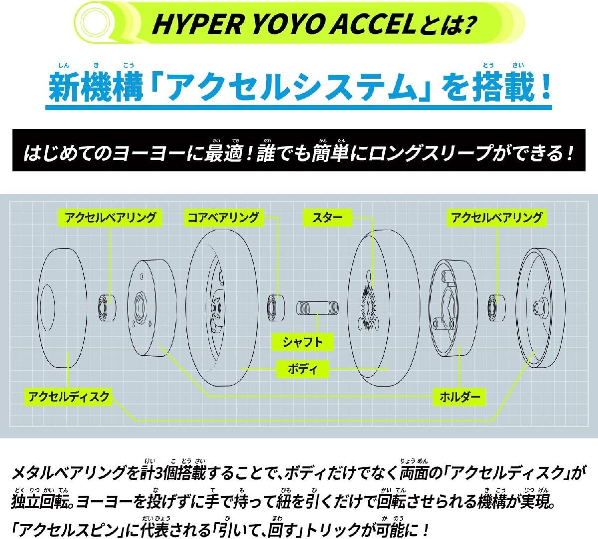 ・本体を手に持った状態でストリングを勢いよく引くことで、本体を投げずに高速回転させることができる日米で特許出願済の新機能「アクセルシステム」を搭載したハイパーヨーヨーシリーズです。