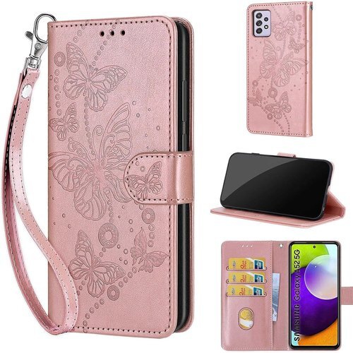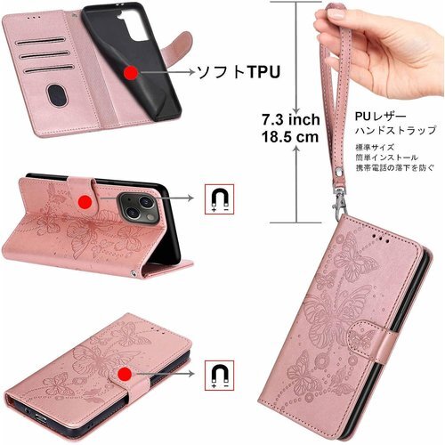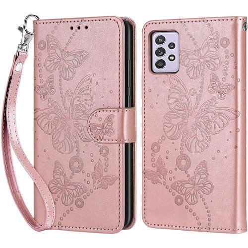 Samsung Galaxy A52 5G ケース 手帳型 対応 galaxy SC53B 財布型 携帯カバー galaxy a52sスマホケース 高PUレザー 耐衝撃 耐摩擦 全面保護 ホルダーバンプパタカード収納 軽量 手触りが良い 人気上品な シンプル気質 ギフト ローズゴールドの蝶 1228