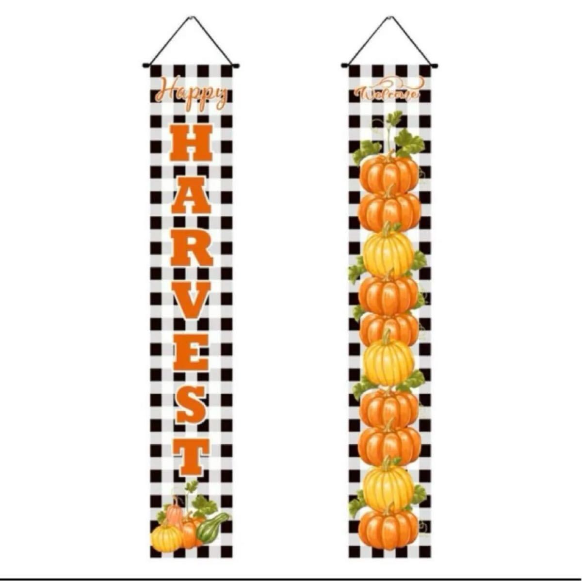 目を引くモノトーンのギンガムチェックを背景に、片方には温かみのあるオレンジ色の文字で「Happy HARVEST」のメッセージ。足元には、ころんとした可愛らしいカボチャやひょうたんが描かれ、豊穣な秋の恵みを感じさせます。