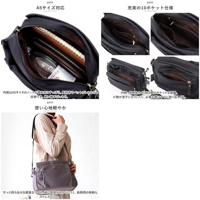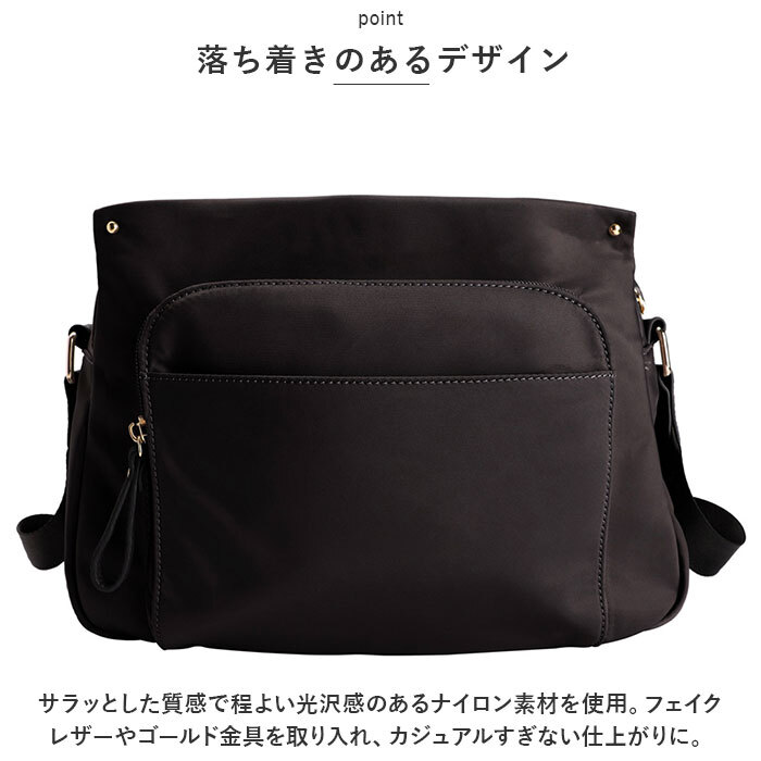 商品説明 | ・・デイリー使いにぴったり。多数のポケットを装備し、荷物がすっきりまとまる「マルチポケットショルダー」が新登場。 ・【落ち着きのあるデザイン】 ・サラッとした質感で程よい光沢感のあるナイロン素材を使用。部分的にフェイクレザーやゴールド金具を取り入れ、カジュアルすぎない仕上がりに。 ・【ちょうどいいサイズ感】 ・小さすぎず大きすぎない!お出かけのマストアイテムをひとまとめにしつつ、満員電車などの人混みでも邪魔にならないマチ設計。 ・【ダブルファスナー開口】 ・開口部は左右どちらからも開閉できる、ダブルファスナー式。ガバっと開いて中身が見渡しやすく、出し入れがラクラク。 ・【A5サイズ対応】 ・内側はA5サイズのノートが横向きにすっぽり。長財布やペットボトルなども収納でき、使い勝手ばっちり。 ・【充実の10ポケット仕様】 ・内側・外側合わせて10個のポケットを装備。小物が迷子になりにくく、必要な時にすぐに取り出しOK。 ・【使い心地軽やか】 ・サッと持ち出せる軽量なつくり。体に負担がかかりにくく、長時間の移動もストレスフリー。 ・【持ち方をアレンジ】 ・ショルダーの長さを調節して、肩掛けも斜め掛けもお好みで。ショルダーは肩に食い込みにくい幅広仕様。 ・【ちょっとの雨なら大丈夫】 ・表面に水滴や汚れを弾く撥水加工済みで、お手入れも拭き取るだけ。(※完全防水ではありません。) ・【選べるカラー】 ・コーデを選ばず使いやすいカラーをラインナップ。シーズン問わず、ヘビロテ間違いなし♪ ・【ポケット仕様】 ・内側:ファスナーポケット×2、オープンポケット×3 ・前面:マグネットポケット×1、ファスナーポケット×1、オープンポケット×1 ・背面:マグネットポケット×1、ファスナーポケット×1 |