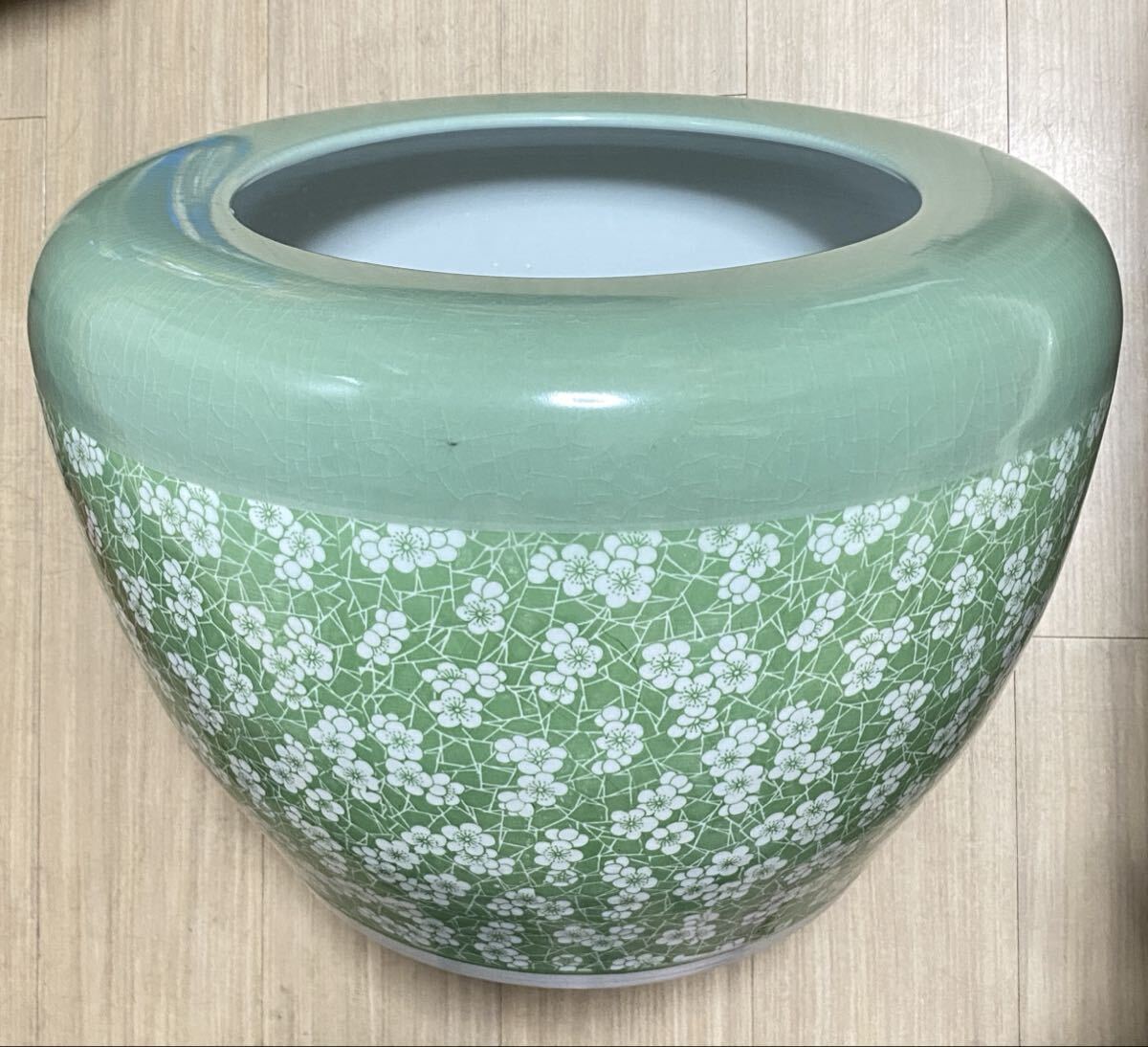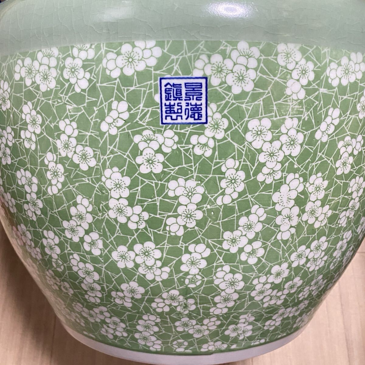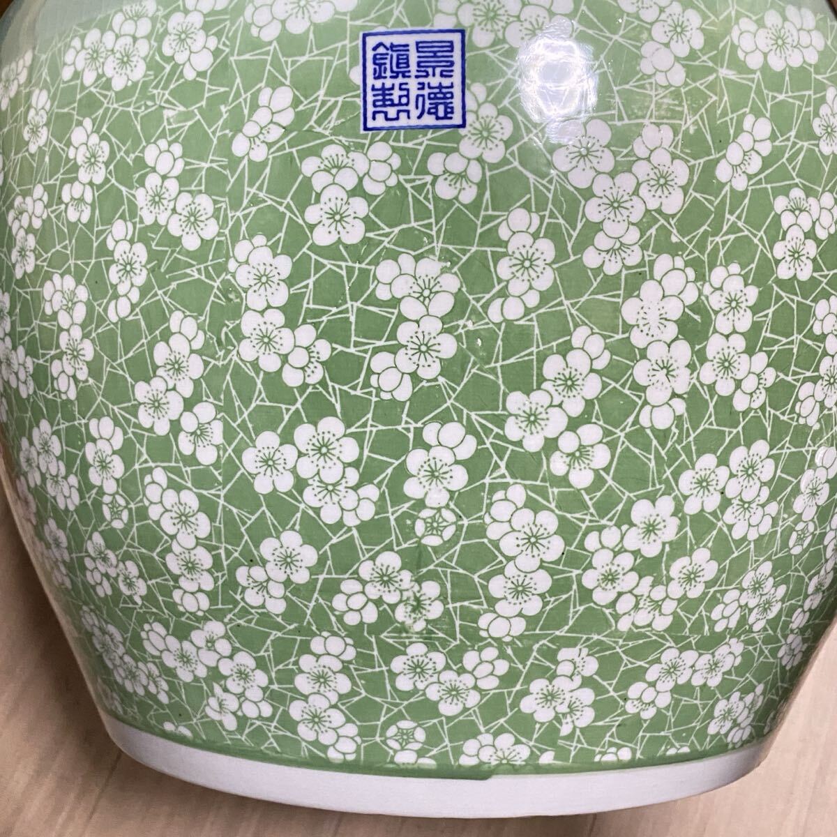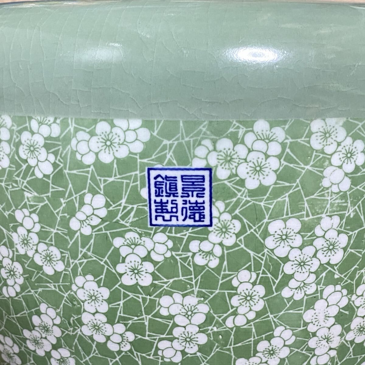 古美術 青磁風 緑釉 梅花文様 鎮窯銘 大型陶磁器 骨董品 古玩 中国美術 花器 置物 和室 洋室装飾 和モダン