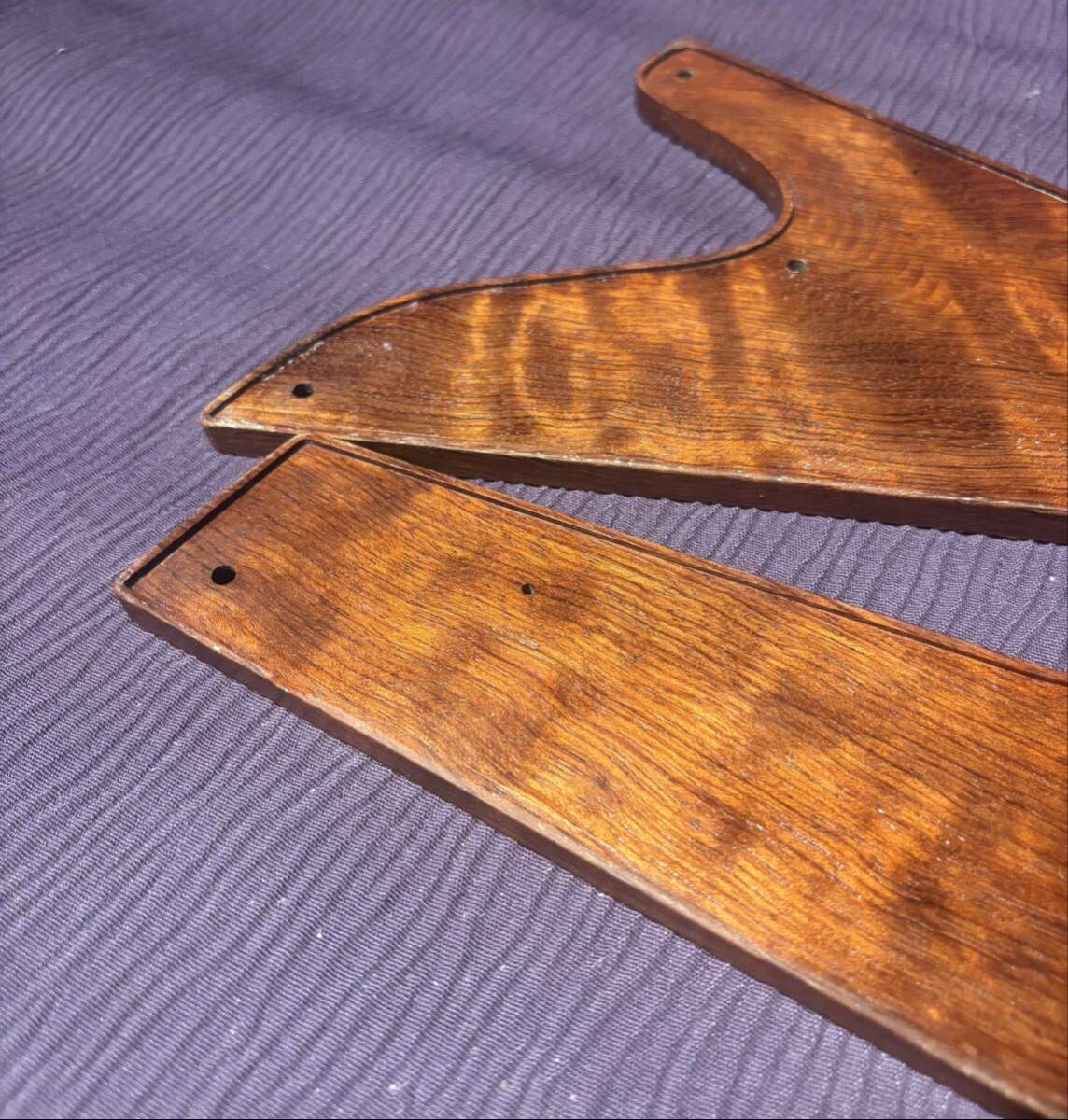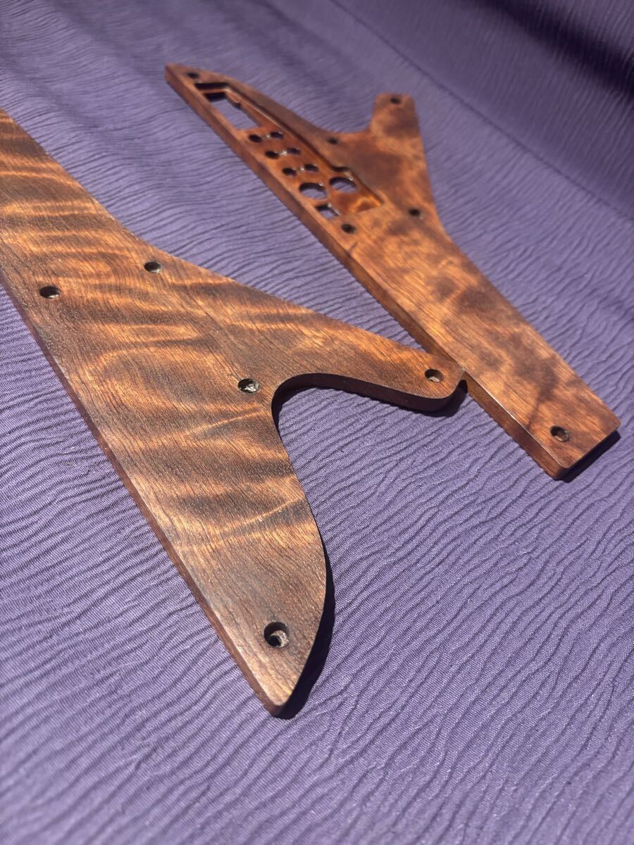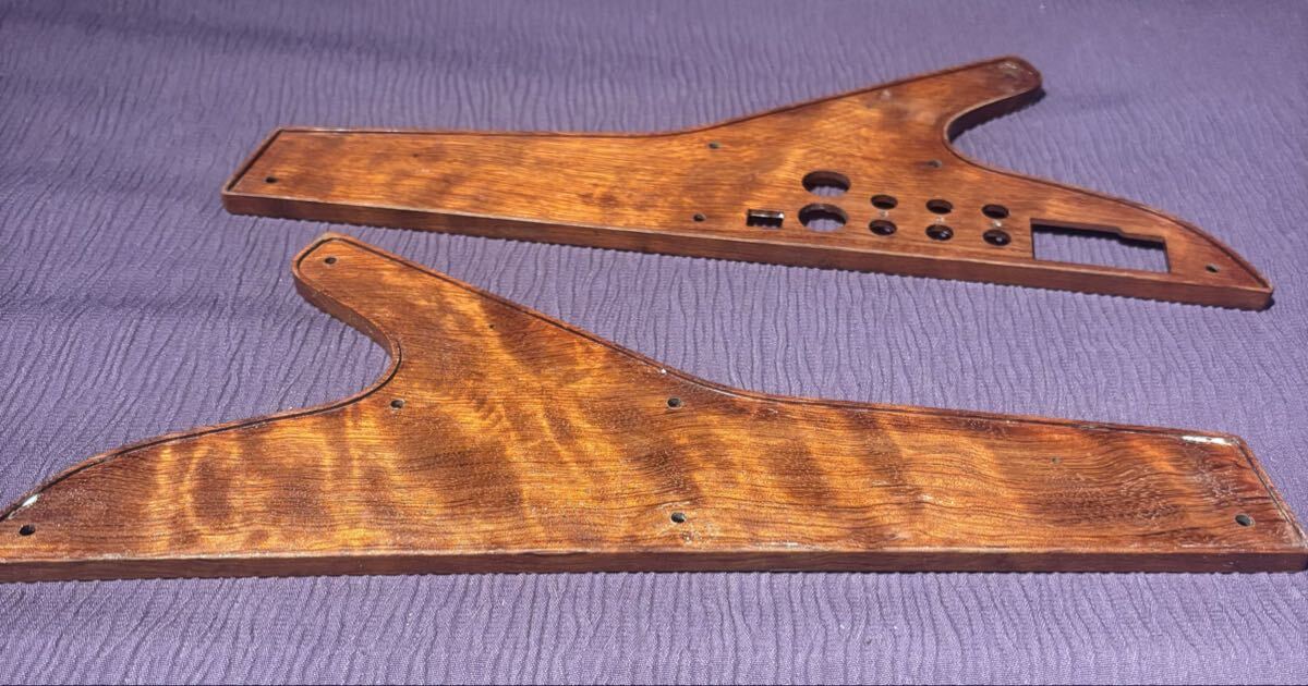 ブビンガは地味な見た目から美しい見た目まで色々と有りますが、今回使用したのはギターやベースのトップ材に使用される最高品位のブビンガで作られています。