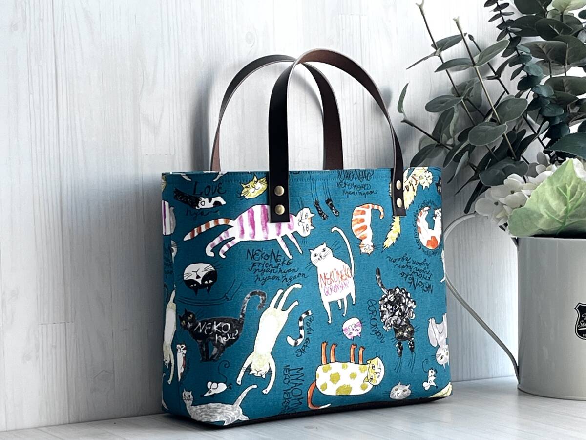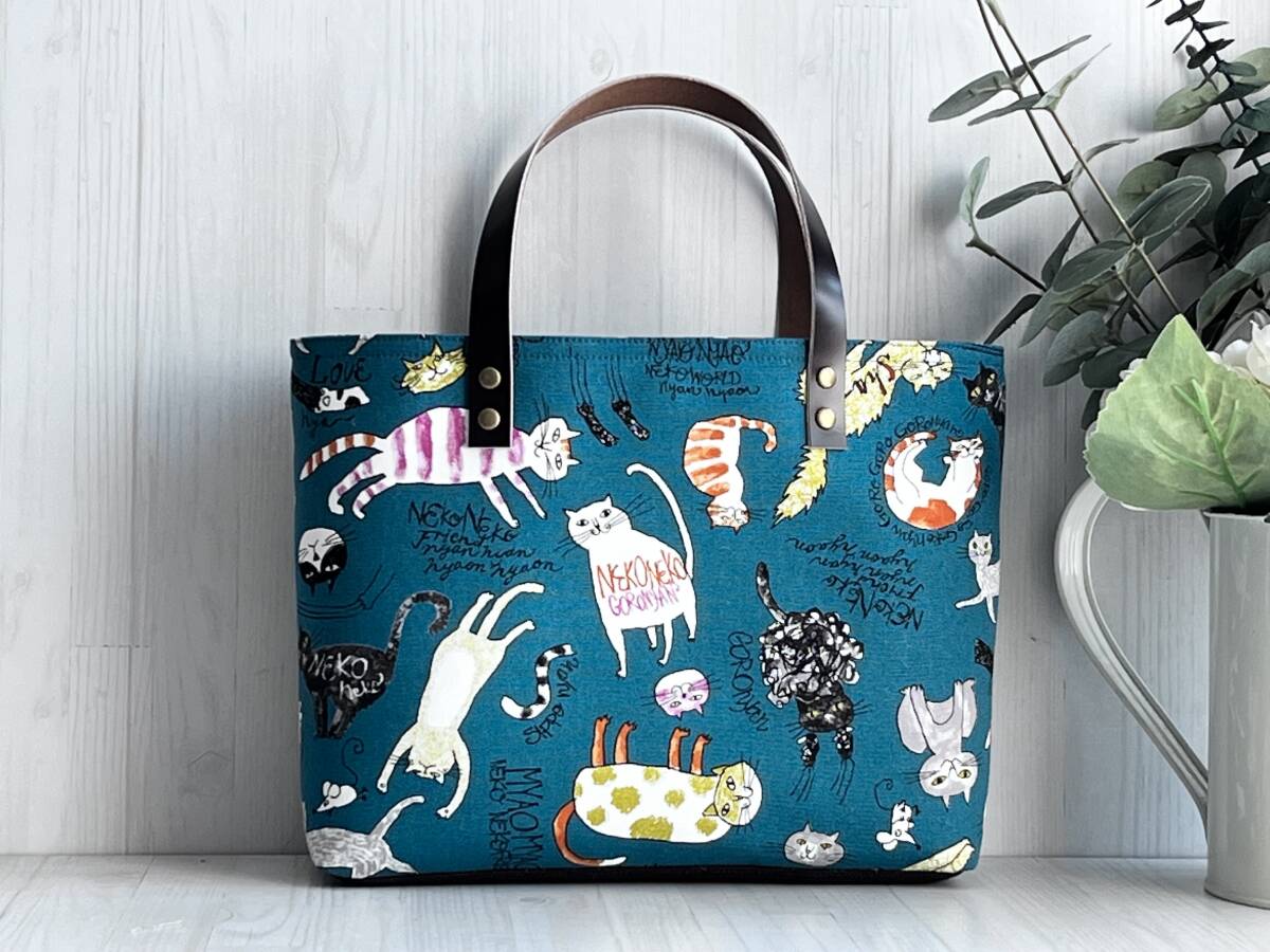 ハンドメイド+コットンリネン+キャット+クロネコ+秋色+グリーン+ハロウィン*ネコ + Mサイズ+トートバッグ +本革+秋色+帆布