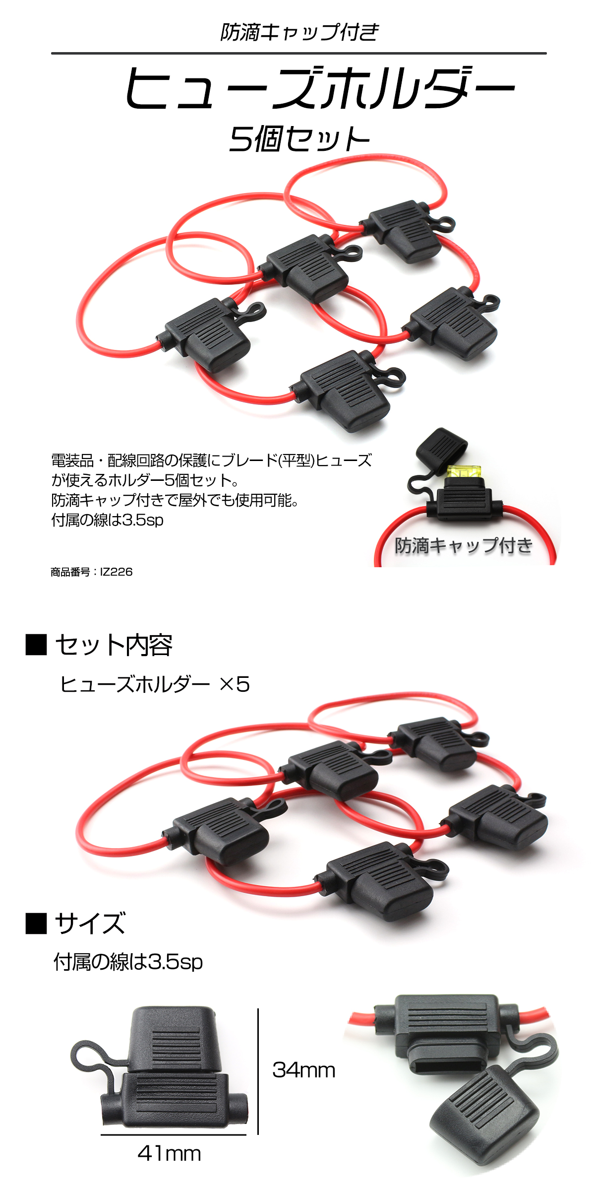 ■商品コード IZ226 ■商品タイトル 平型ヒューズホルダー 防滴タイプ 5個セット ■数量 数量1で5個 ■特徴 電装品・配線回路の保護にブレード(平型)ヒューズが使えるホルダー5個セット。 防滴キャップ付きで屋外でも可能。 ※ヒューズ本体は付属しません。 |
