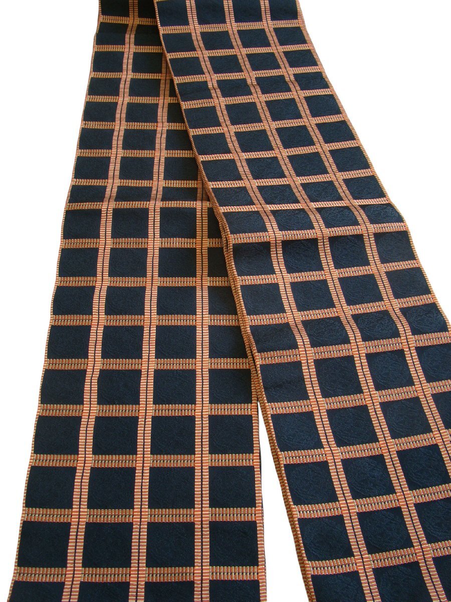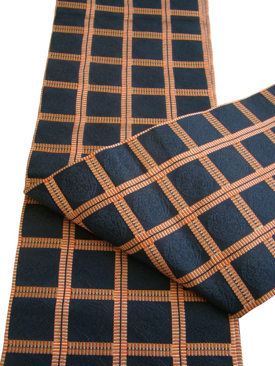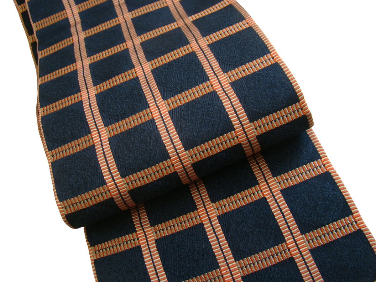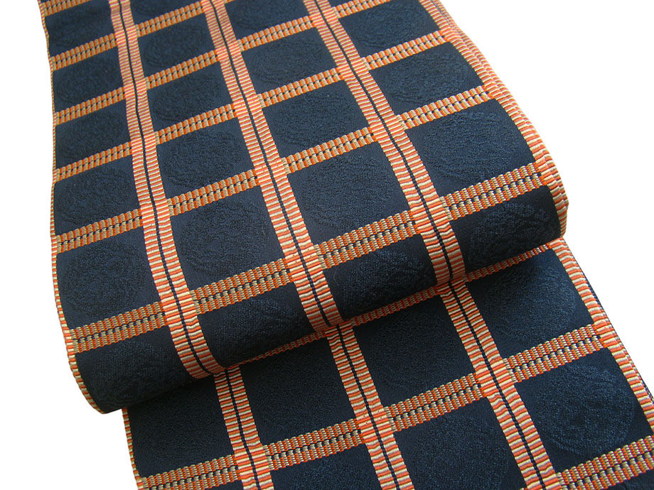 商品の説明 | ●USED品、シミ、汚れ無し。 ●正絹 しっかりとした結び易い西陣織両面四寸帯。 全通柄。 紺地に砂色地、朱色の格子柄。 ※両面仕様の四寸帯です。 紬や小紋に合せられると良いでしょう。年代に関係なくご使用出来ます♪♪ |