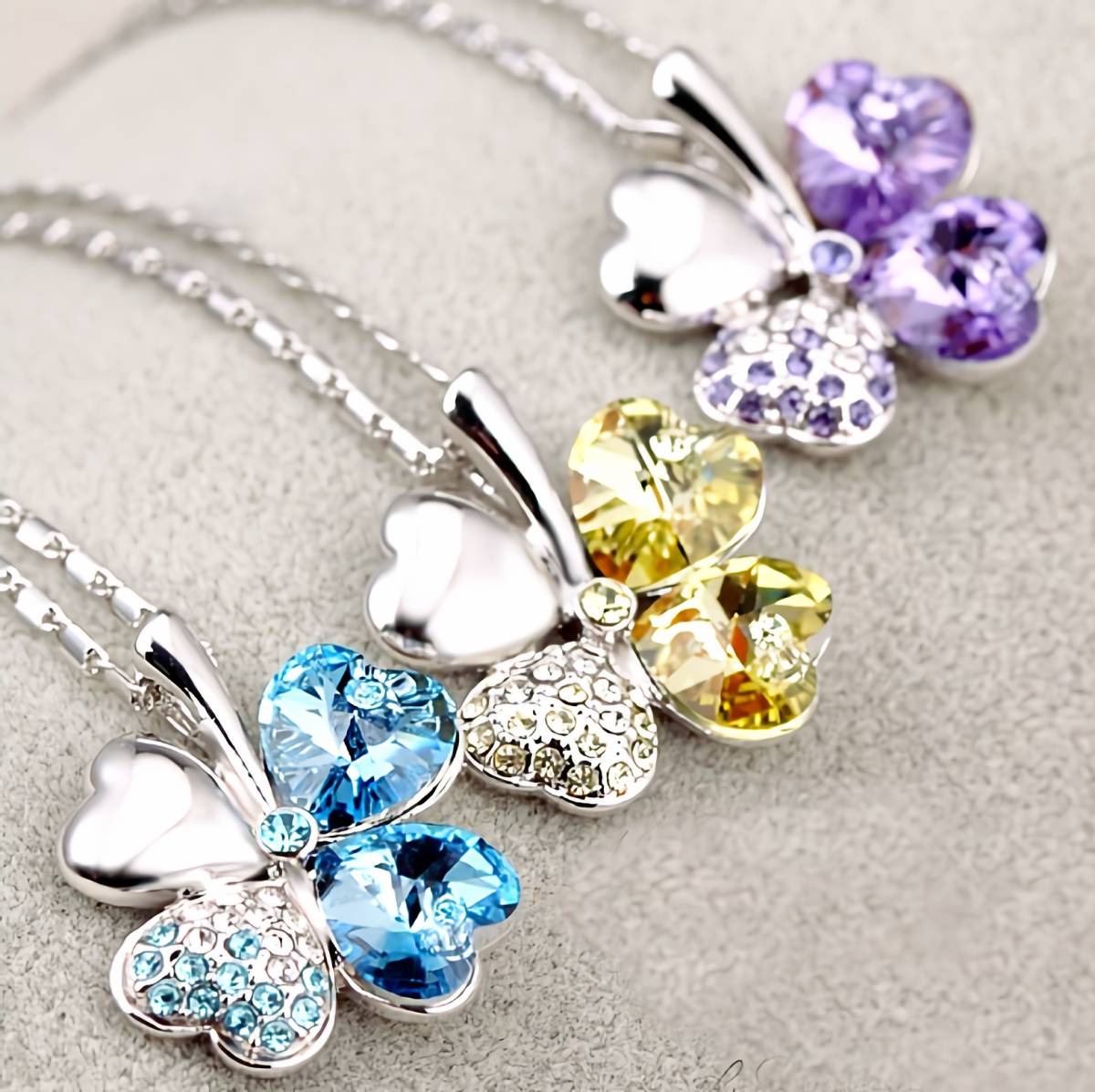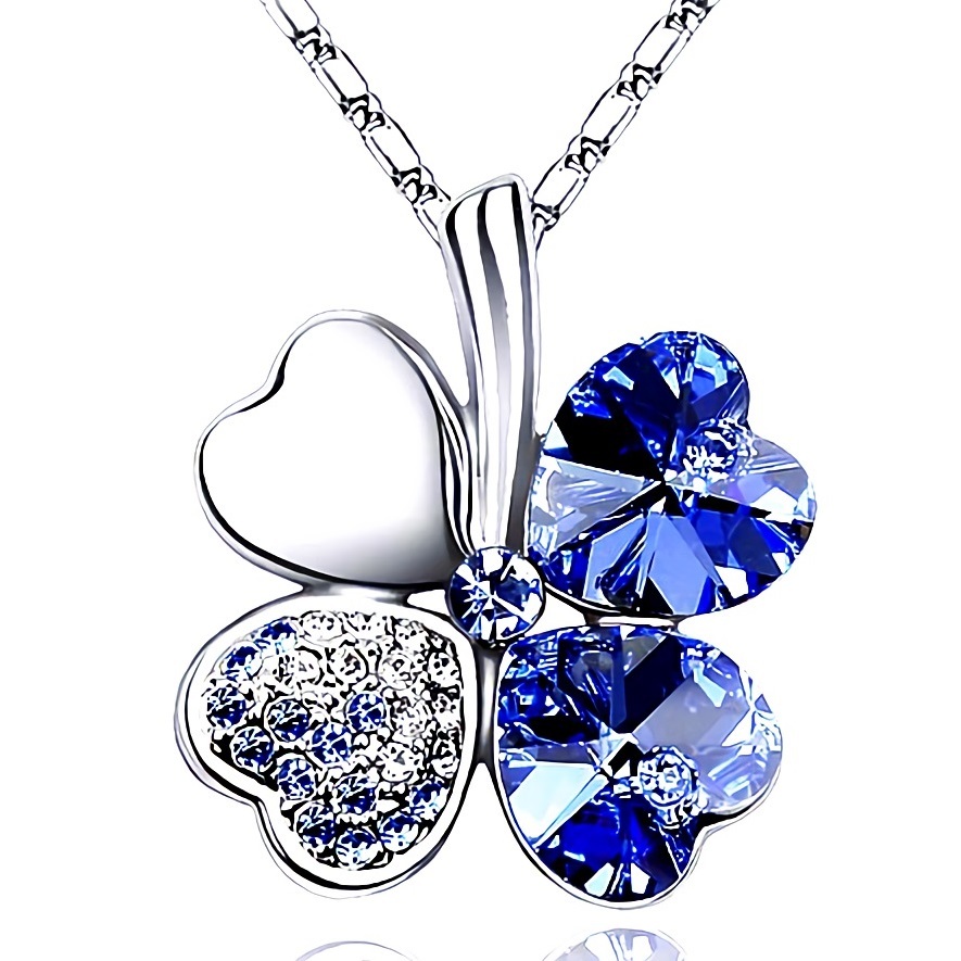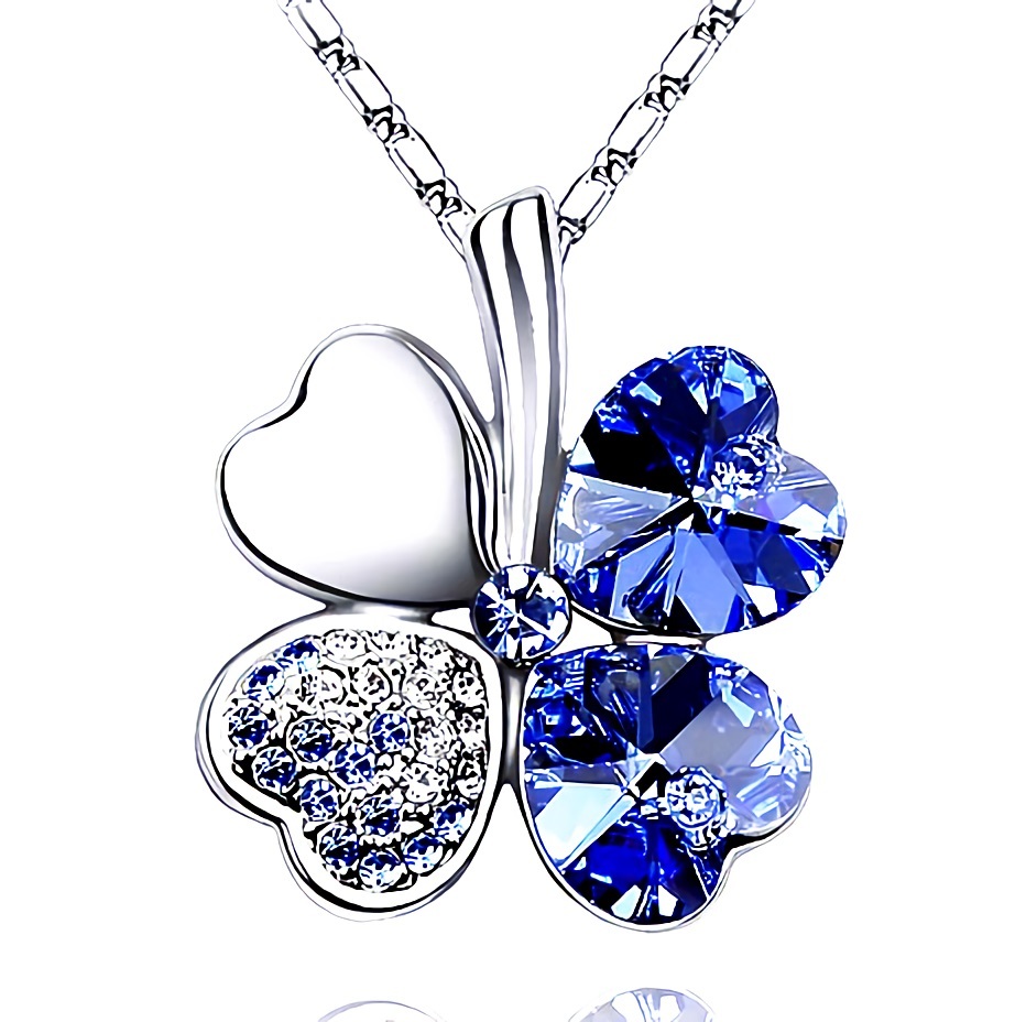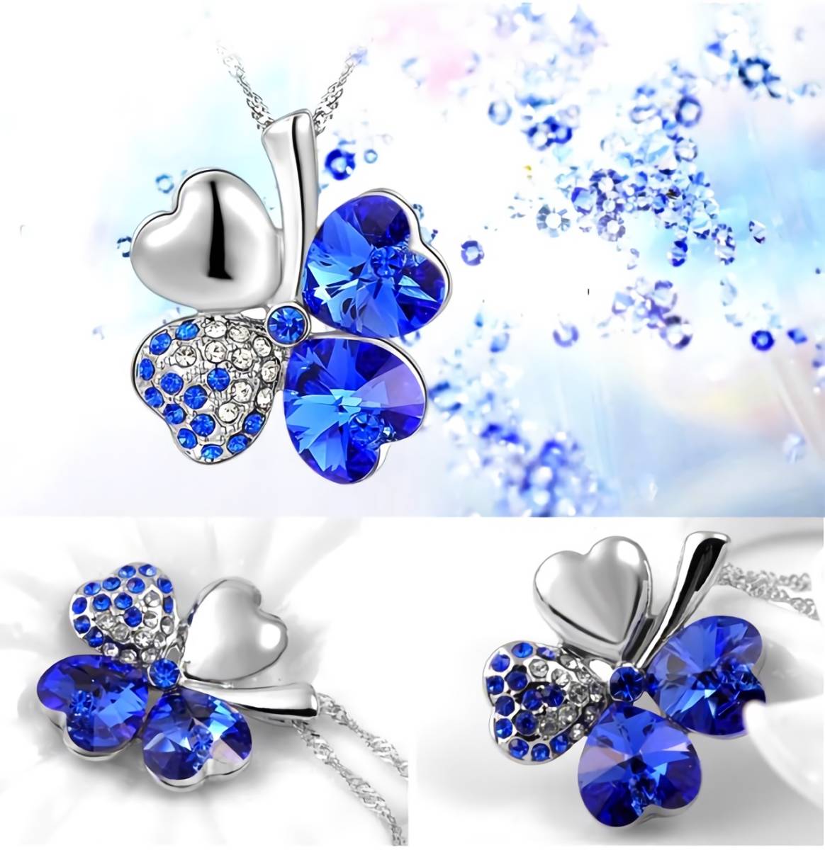 青色に輝く四葉の葉が美しく、キラキラ輝くペンダントトップは胸元で存在感ある輝きを放ちます。