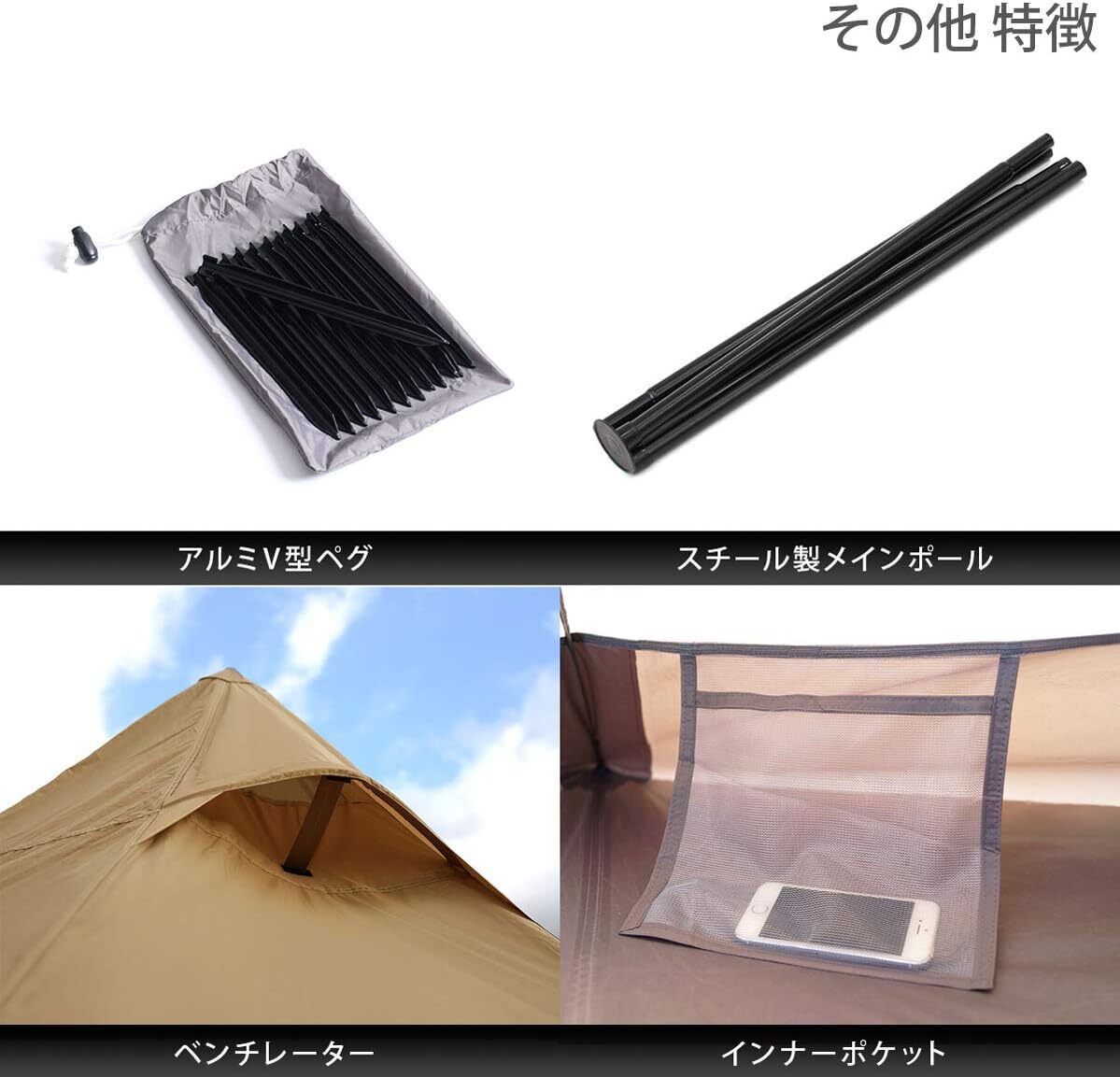 ※数年使用しての感想(ソロキャンで使用) 付属のペグは微妙に弱いので丈夫なペグの購入をオススメします。