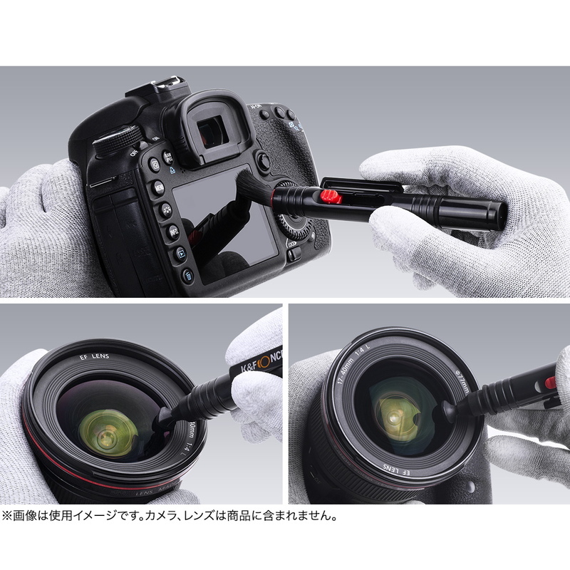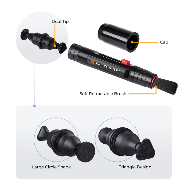 | K&F Concept(ケーアンドエフコンセプト)の付け替え式のクリーニングヘッドとブラシが付いたレンズクリーニングペンです。 クリーニングペン1本に3つの機能を集約 ブラシは、本体側面のレバーで出し入れができる伸縮式です。ブラシ素材は、緻密で柔らかく、埃や隙間もきれいに掃除できます。 クリーニングヘッドは、落としにくい汚れを除去する専用のチップが付いています。丸形と三角形の2種類があり用途によって使い分けができます。