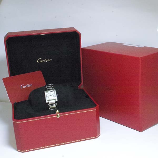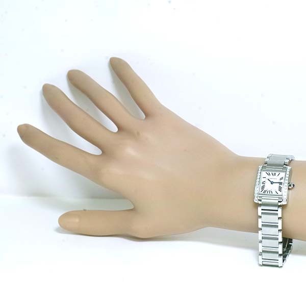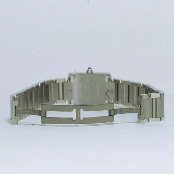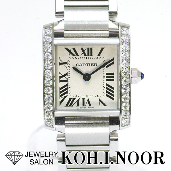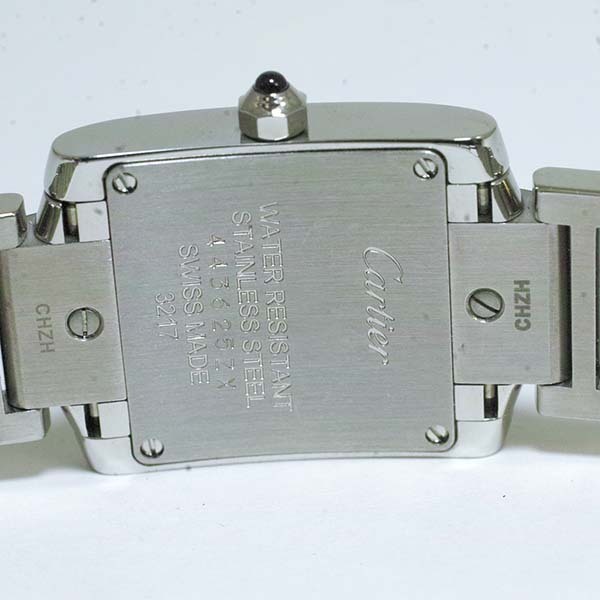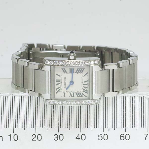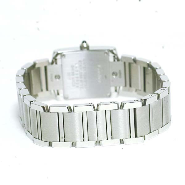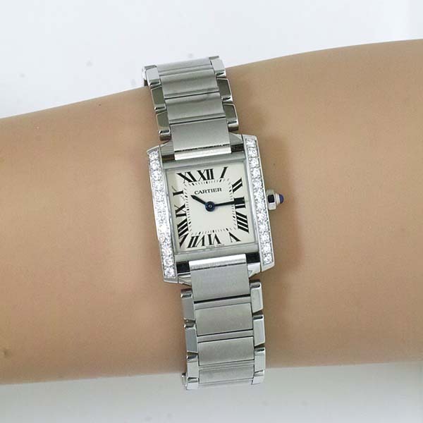 ケースサイドにダイヤをセットしたステンレス製のタンクフランセーズ。クォーツ式レディースウォッチ。