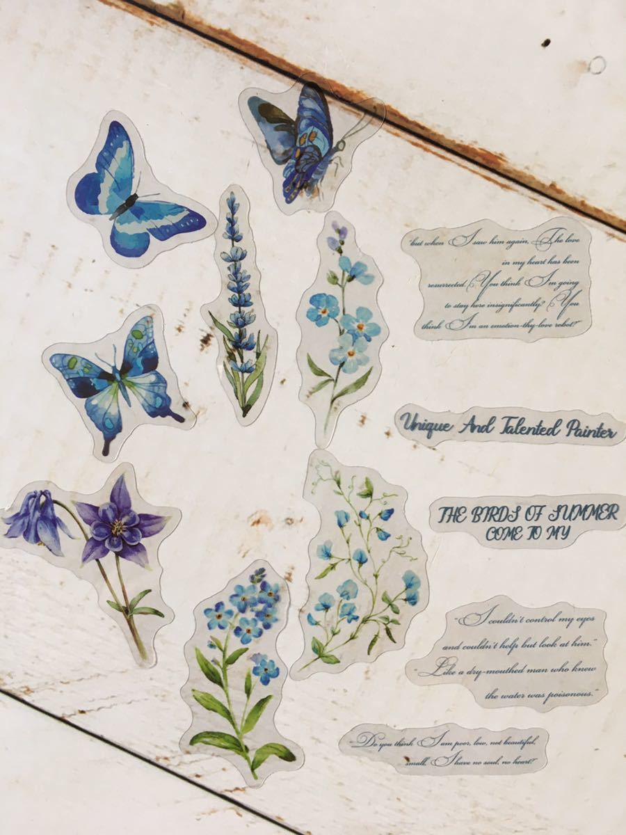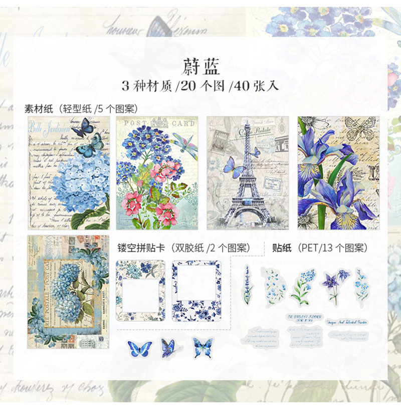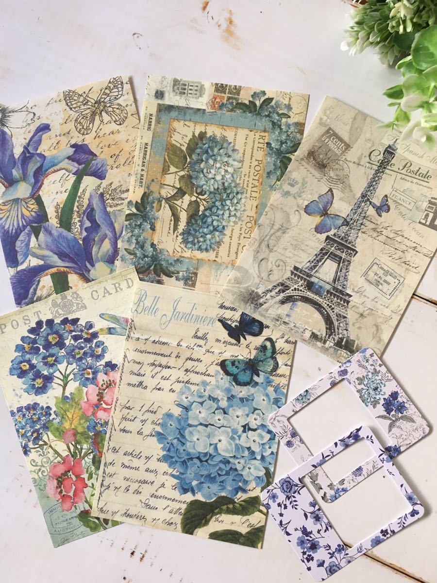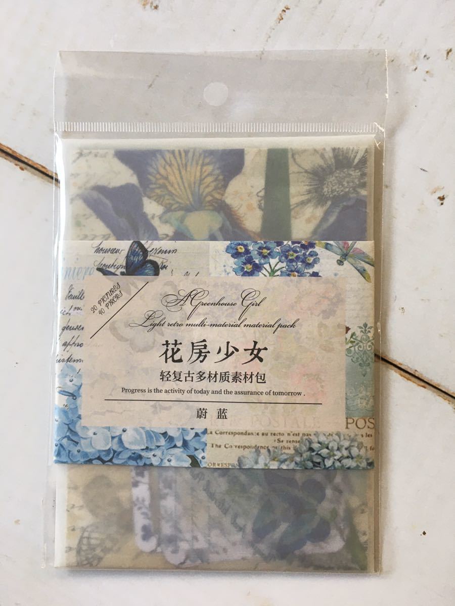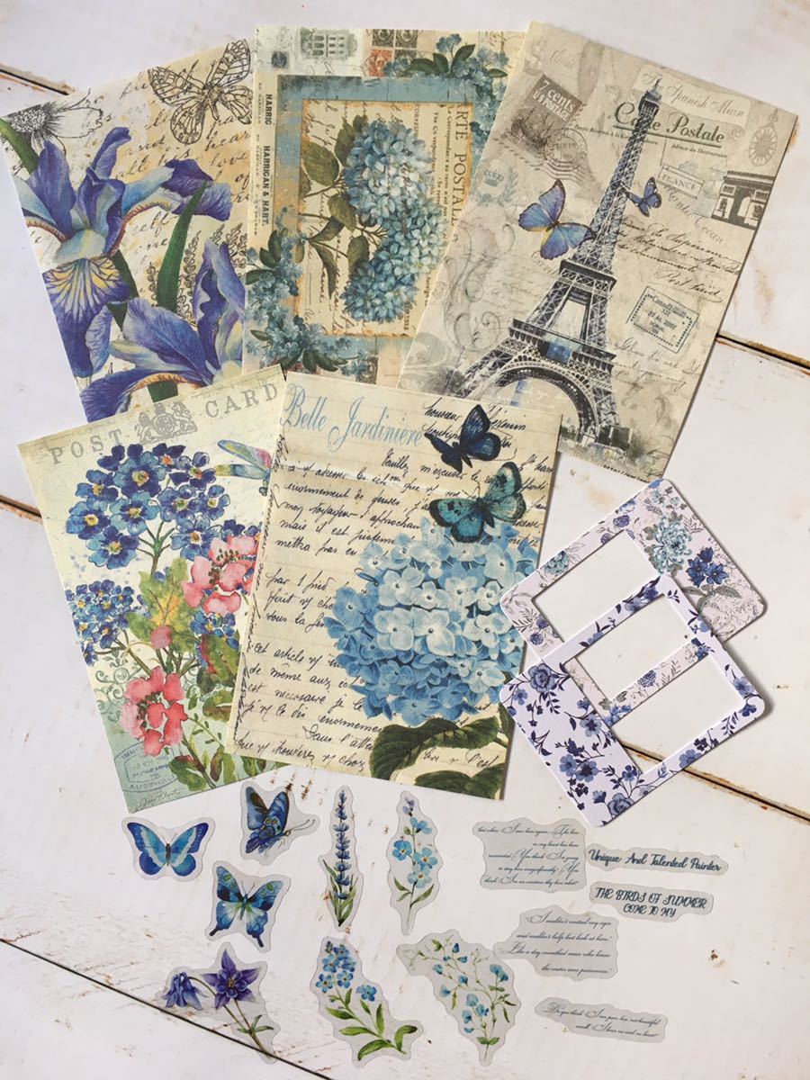 レトロ素材♪シール+素材紙+穴あきカード 合計40枚 ブルー コラージュ素材 紙もの アンティーク