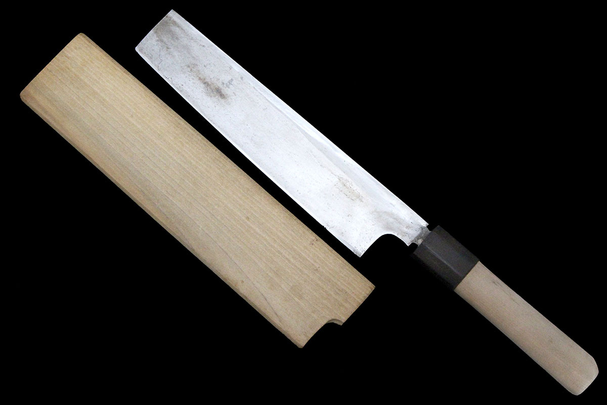 並品|義門 薄刃包丁 霞 八寸 朴柄 白鞘付 KN02-A9404-2L3B