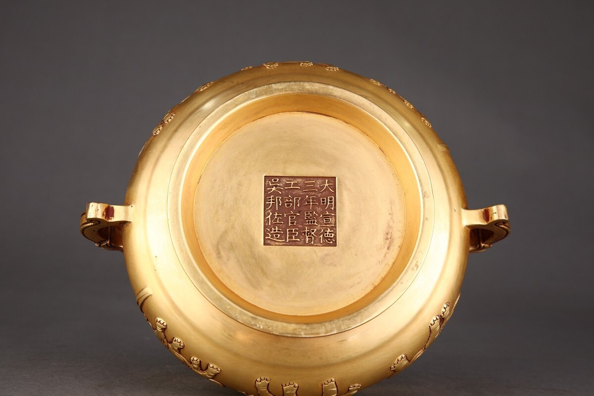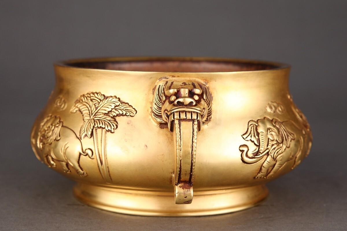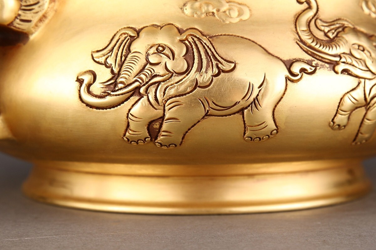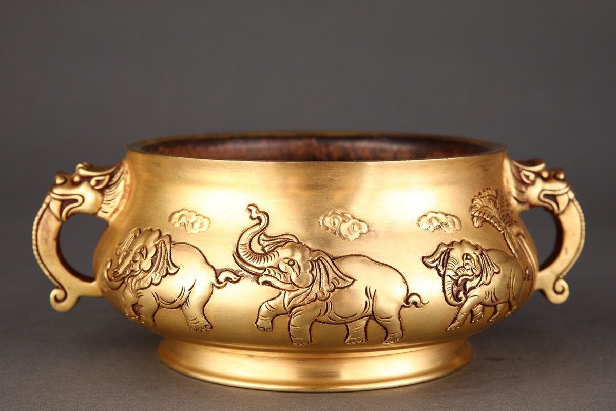 「大明宣徳三年監督工部官臣呉邦佐造 古銅彫 塗金太平有象紋 龍首耳老銅香炉」旧銅器 置物擺件 賞物 中国古美術 旧蔵出