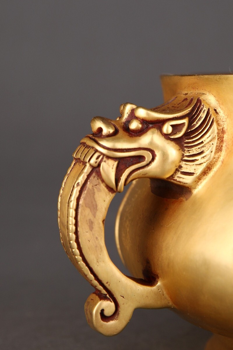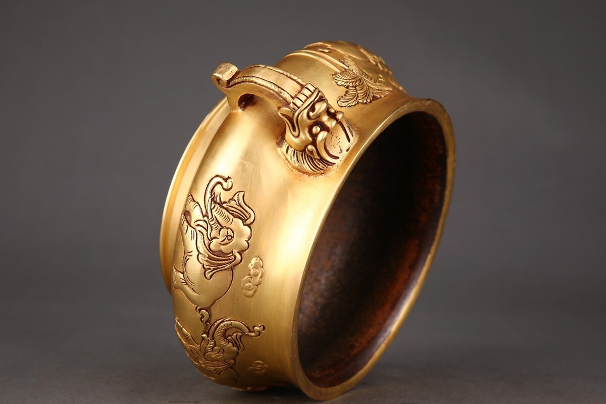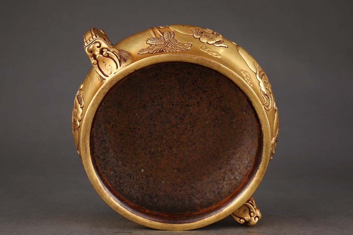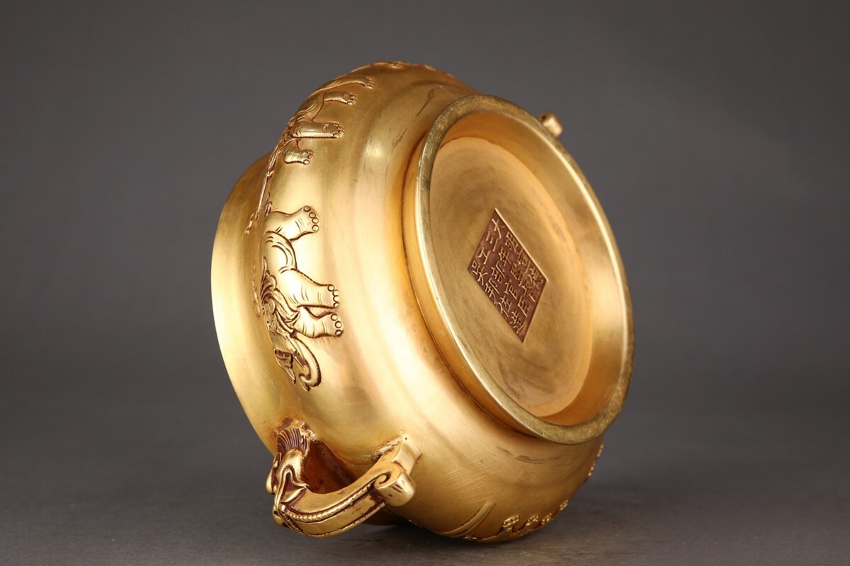 「大明宣徳三年監督工部官臣呉邦佐造 古銅彫 塗金太平有象紋 龍首耳老銅香炉」旧銅器 置物擺件 賞物 中国古美術 旧蔵出