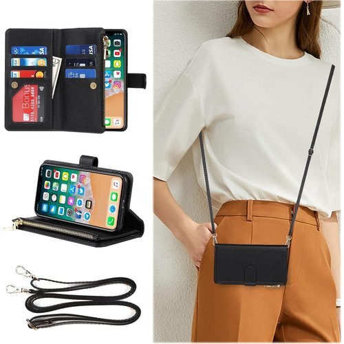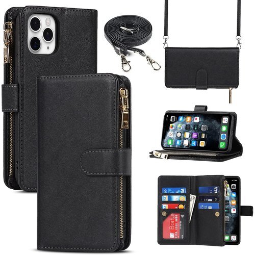 Pelanty for iPhone 11 Pro 縄掛けケース 手帳型 携帯カバー 肩掛け首かけ斜めがけ ショルダー 合成皮革+TPUケース マグネット iPhone11 pro 財布型カバー ICカード お札入れ小銭入れ大容量 収納ポケット スタンド機能 アイフォン11プロ ストラップ付き 落下防止 耐衝撃 耐摩擦 全面保護 肩縄付き-ブラック 191
