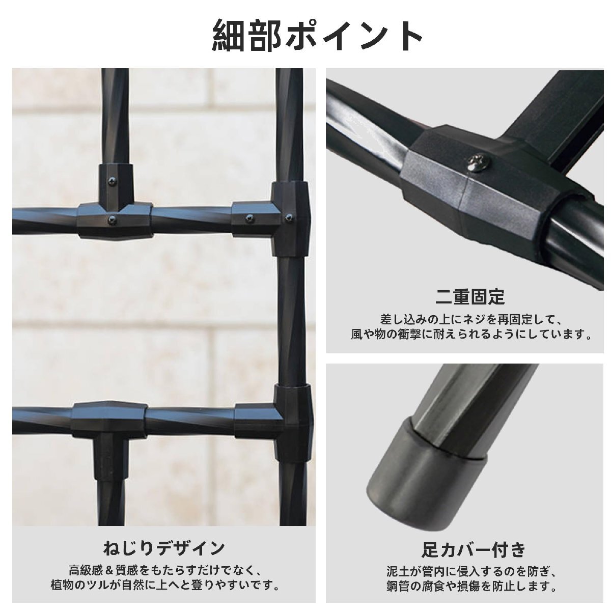 【太パイプ構造で安定性抜群】直径20mmのスチール製支柱を使用したアーチ構造は、非常に安定感があり、風が強い日や重い植物を絡ませても安心。脚部は密閉されており、水や空気の侵入を防ぎ、屋外ガーデニングに最適な園芸用品として長く活躍します。
