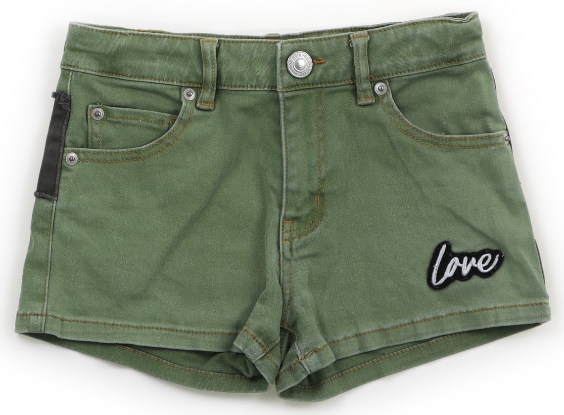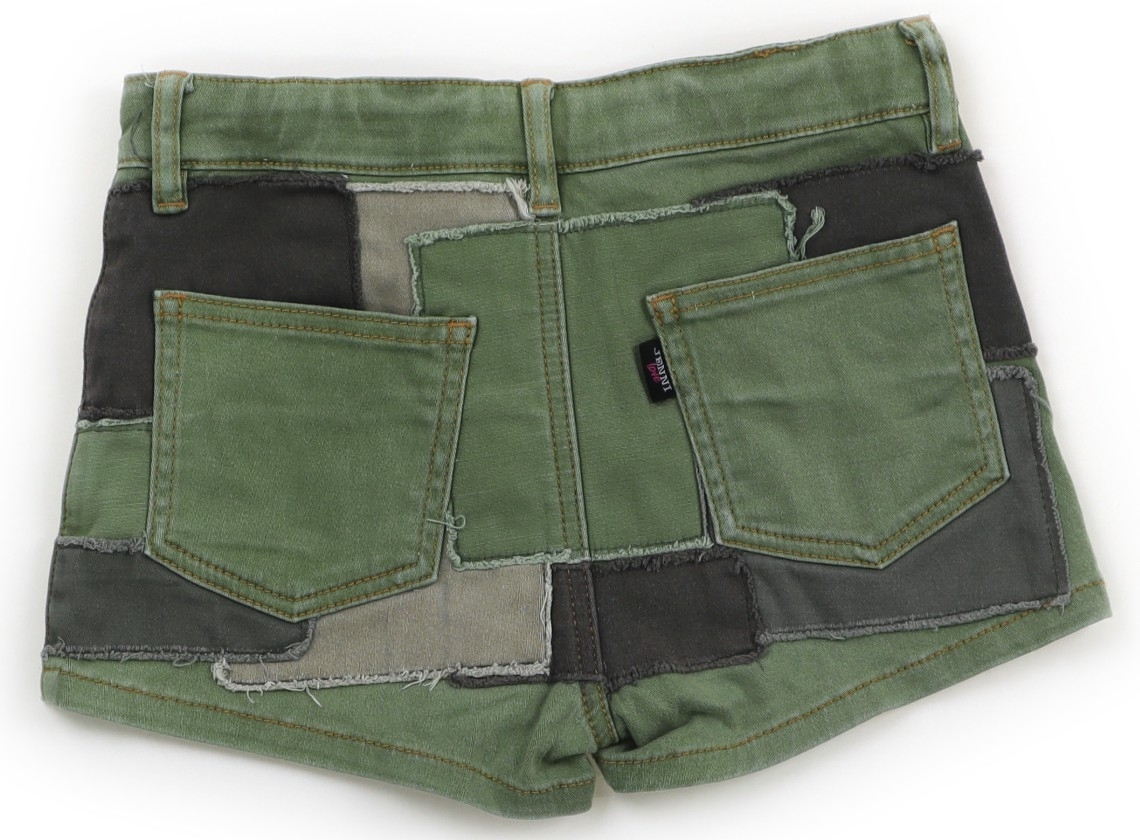 デニム生地です。ウエストにサイズ調整ゴムが付いています。左ウエストとポケットに薄く1cm~3cmほどの白い汚れがありますが、まだ活躍してくれそうです。後ろはパッチワークデザイン。