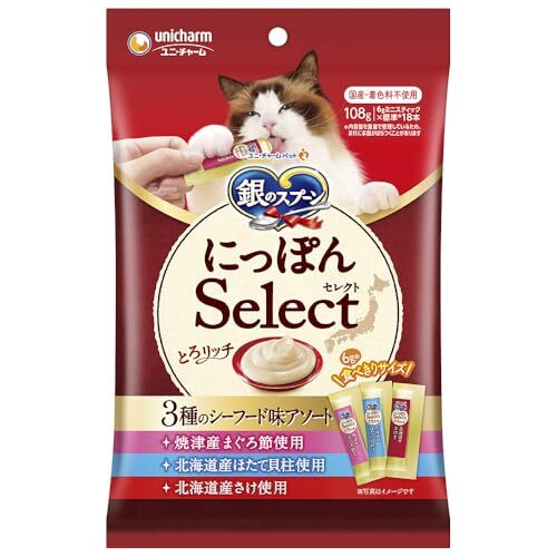 「3種のシーフード味アソート銀のスプーン にっぽんSelect とろリッチ まぐろ節・ほたて貝柱・さけ 108g 猫用おやつ国産/食べきりサイズ/」▼4520699616673▼(商品説明)ー/108グラム (x 1)/-・FlavorName:3種のシーフード味アソート・パッケージ個数:1・キャットフード 副食・日本各地の「お取り寄せ」素材を使用した、とろ~りウェットタイプの上質なおやつ・6gで食べきりサイズ・国産、着色料不使用・ひと袋に3種類の味が詰まったアソートタイプ商品紹介 ・素材の産地にこだわった上質なおやつです。日本各地からのお取り寄せ素材を使用した、とろ~りウェットタイプおやつ。 ・6gの食べ切りサイズなので、毎回開けたての美味しさ。 ・国産で着色料、発色剤不使用。安心して猫ちゃんにあげられます。 ・スティックからそのままあげやすいやわらかさのおやつです。 ・焼津産まぐろ節、北海道産ほたて貝柱、北海道産さけ使用の3種類の味が詰まったアソートタイプ 原材料・成分 原材料(成分) まぐろ節使用 鶏胸肉、魚介類(まぐろパウダー、まぐろ、焼津産まぐろ節)、調味料、増粘多糖類 ほたて貝柱使用 鶏胸肉、北海道産ホタテ貝柱パウダー、調味料、増粘多糖類 さけ使用 鶏胸肉、北海道産さけ、調味料、増粘多糖類 成分 3種共通 タンパク質6.0%以上、脂質0.5%以上、粗繊維1.0%以下、粗灰分3.0%以下、水分95.0%以下 エネルギー 3種共通 約3kcal/1本 使用方法 ー