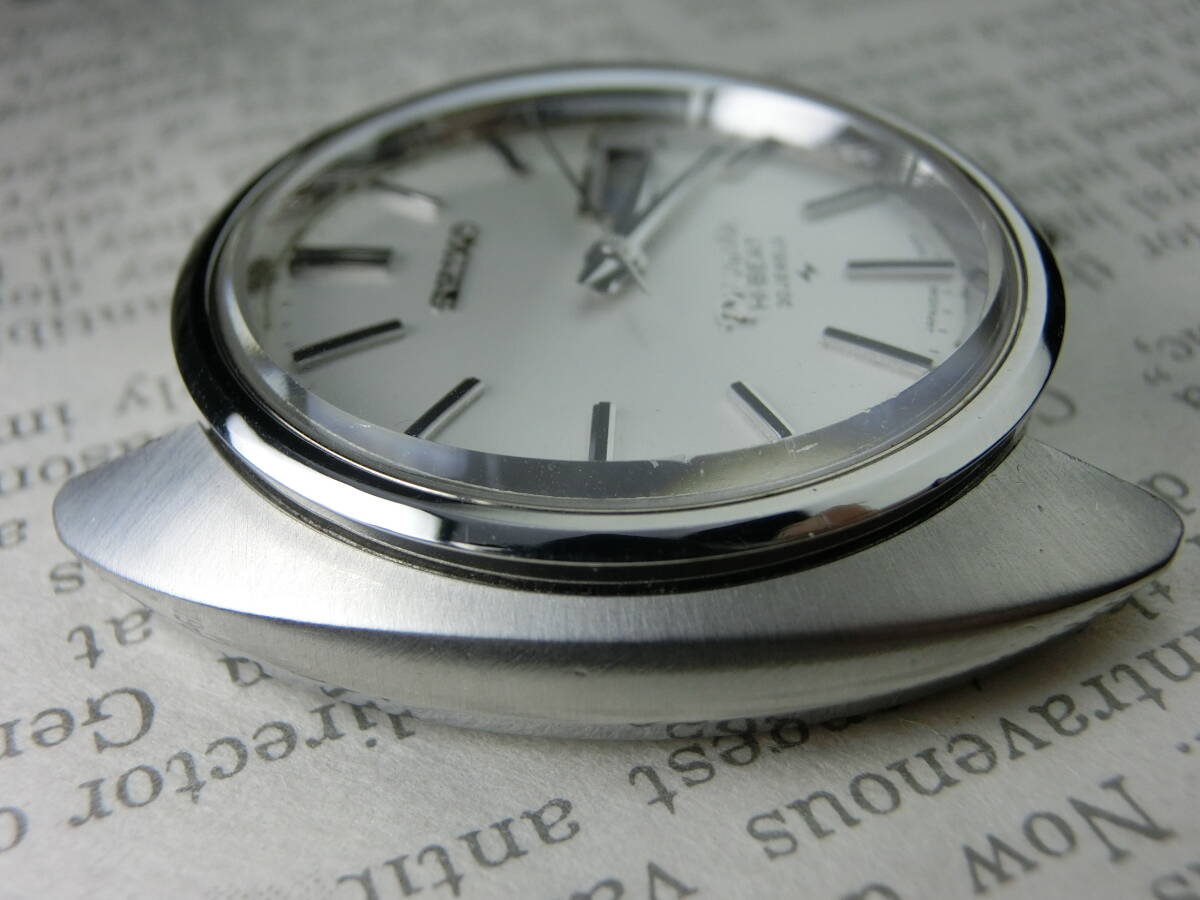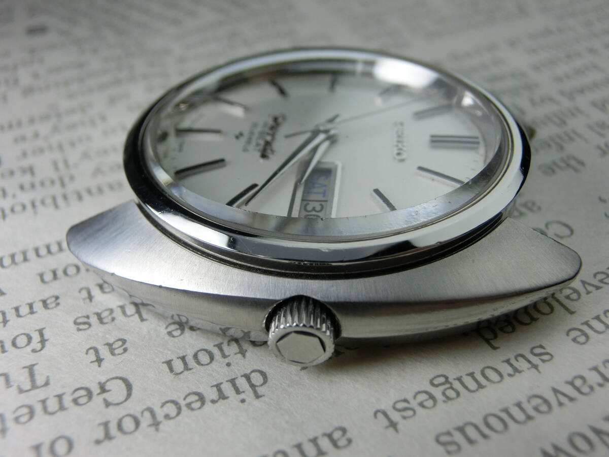 日付けの早送りはリューズを押し、曜日の早送りは針を回して行います。切り替わりは瞬間切り替えです。