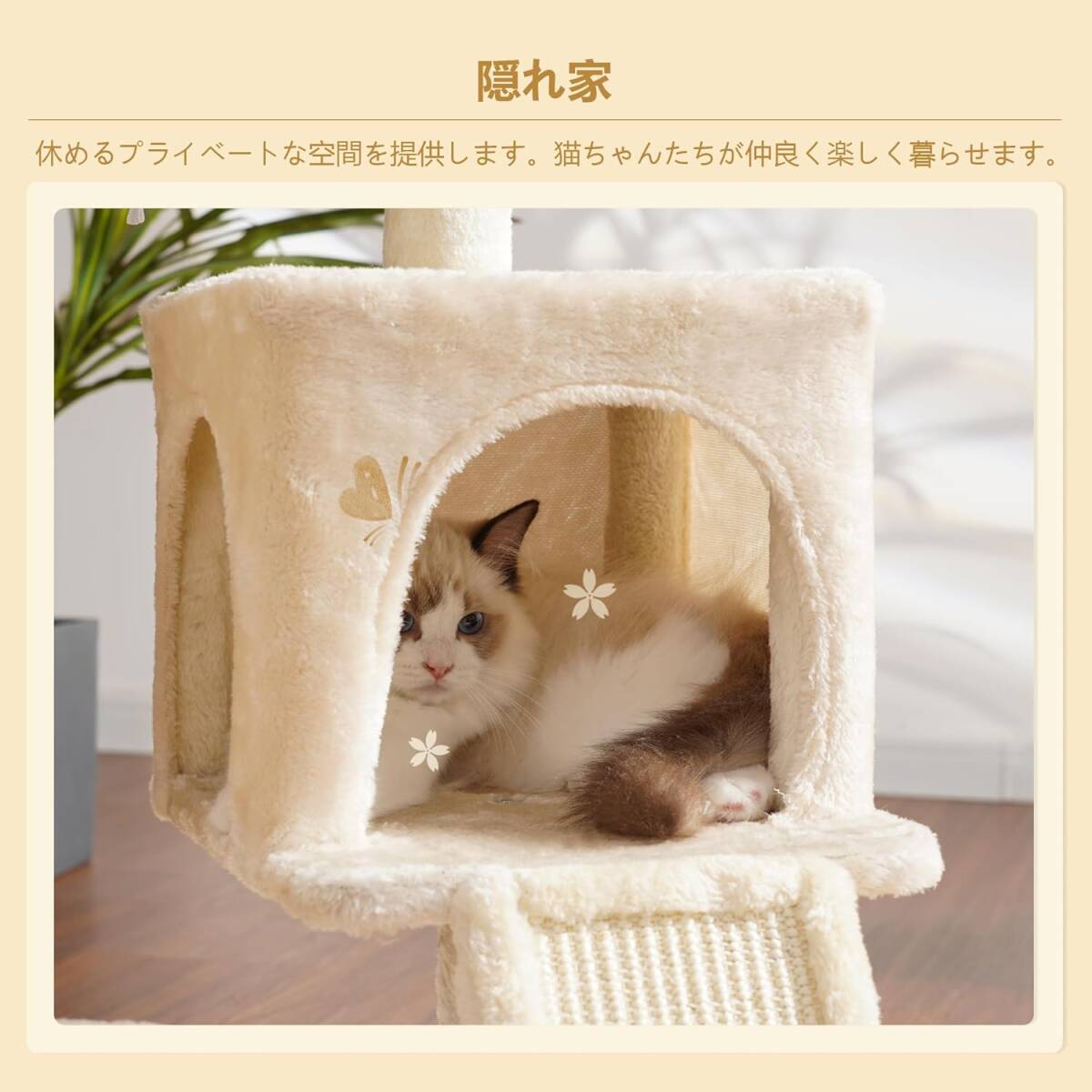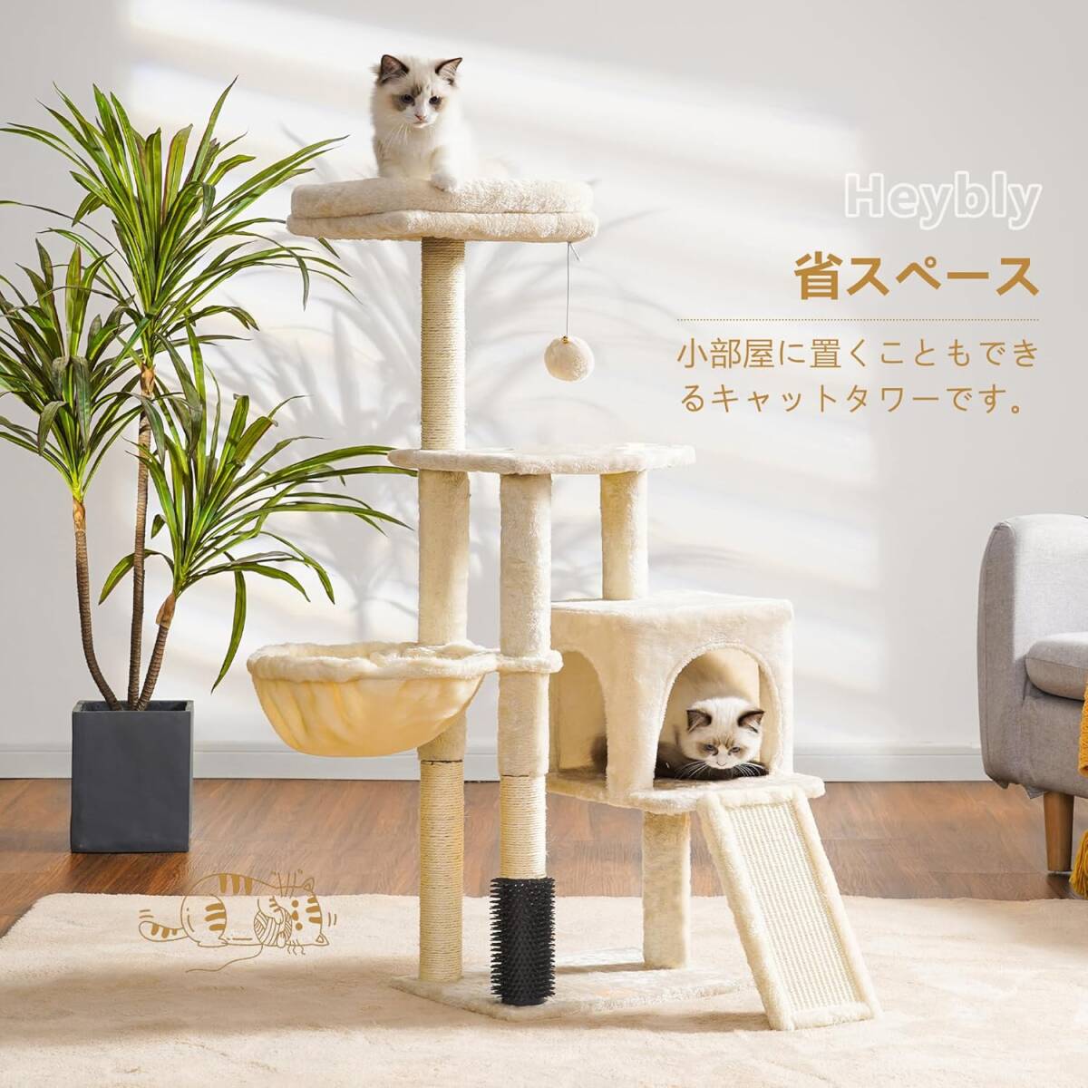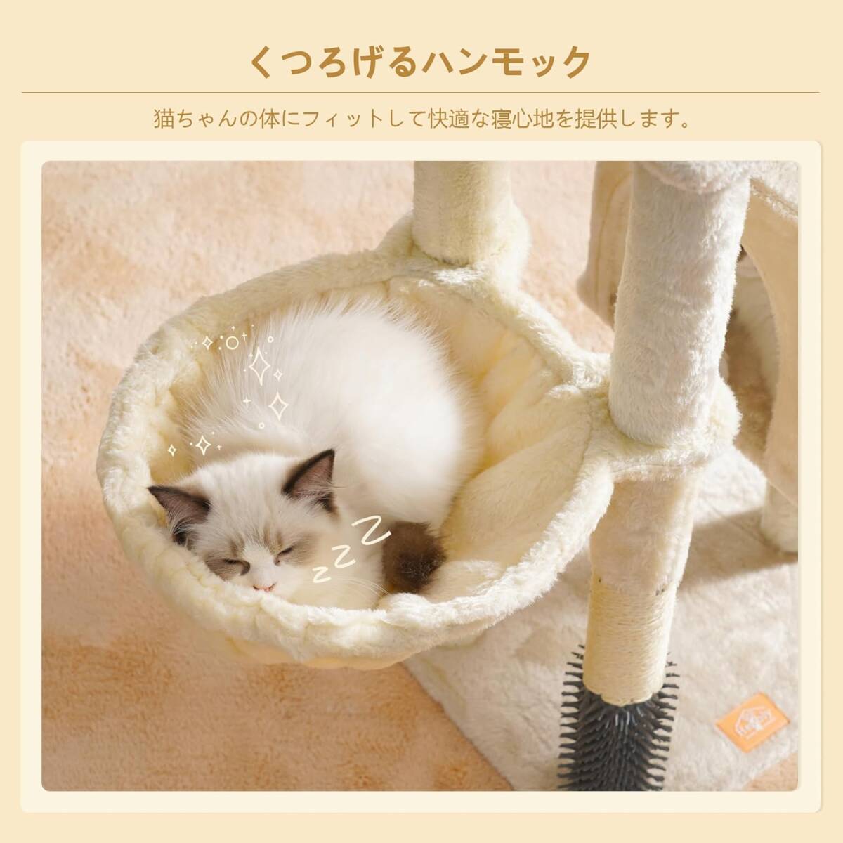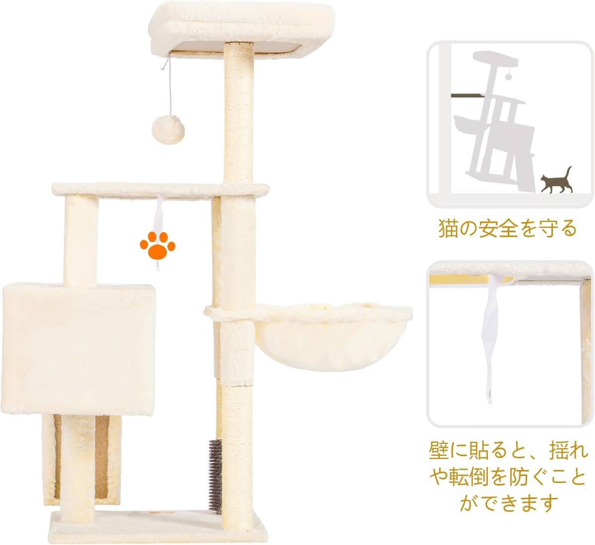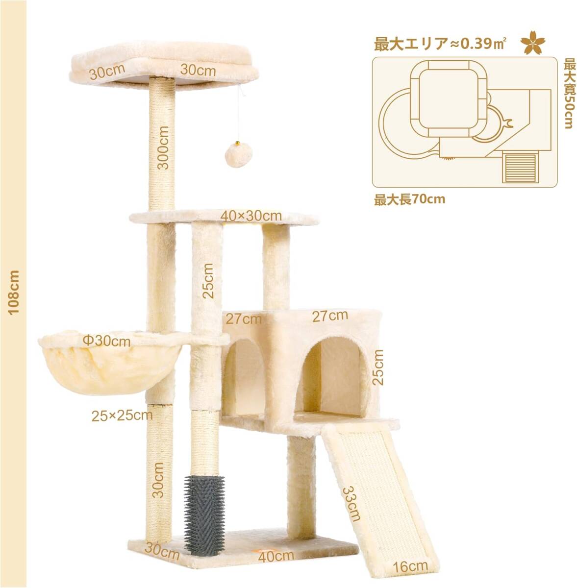 キャットタワー 据え置き型 省スペース 子猫とシニア猫に最適 ハンモック 天然麻ロープを使用した爪研ぎボード 高さ108cm ベージュ