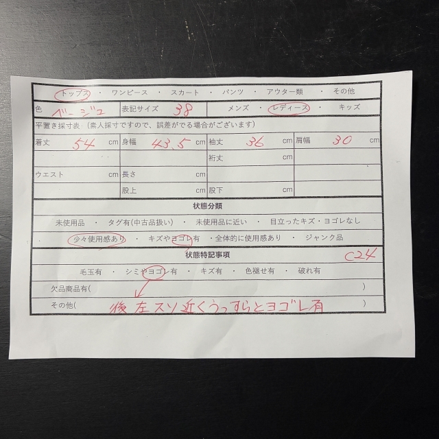 ・シミやヨゴレ有(後左スソ近くうっすらとヨゴレ有)
