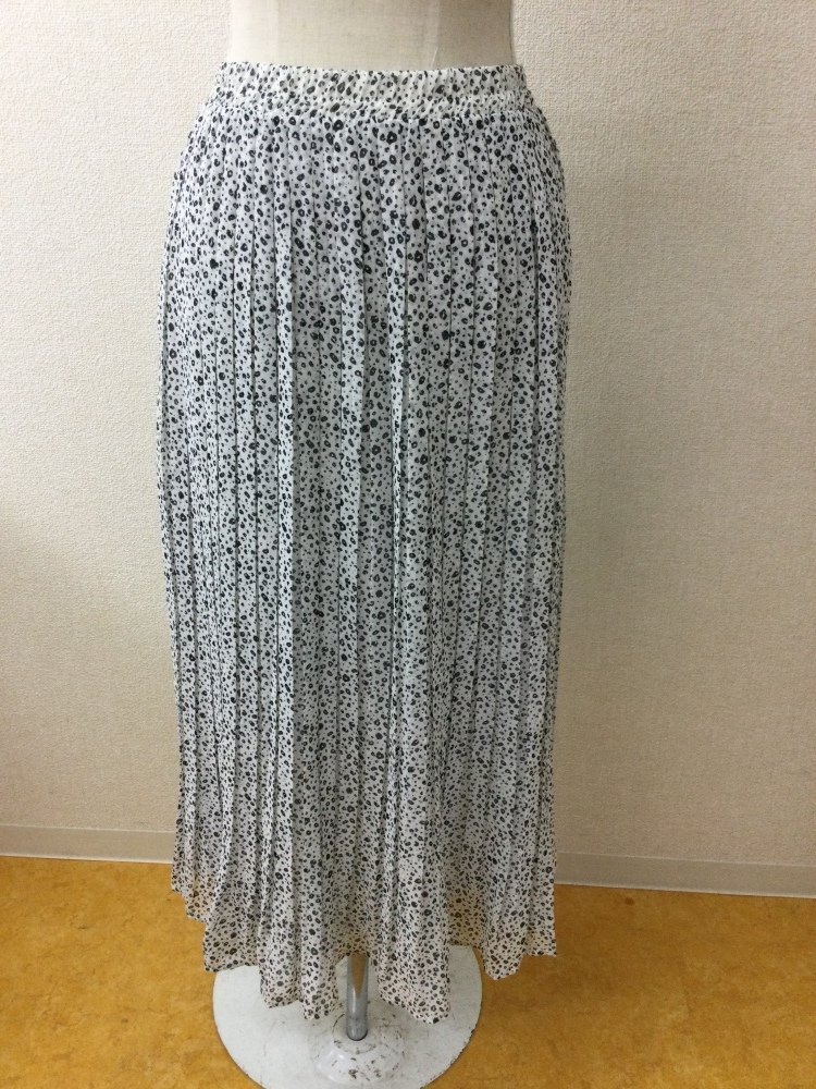 管理番号:10^133564 Melan Cleuge メランクルージュ 白に黒柄シフォン プリーツスカート ウエストゴム 表示サイズ:M 実寸(参考)
