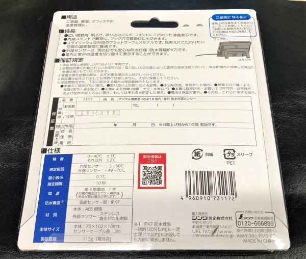 73117 デジタル温度計 smartB IPX7 防水型 外部センサー 70㎜×102㎜×18㎜ スタイリッシュ フラットサーフェス (-ss01k-