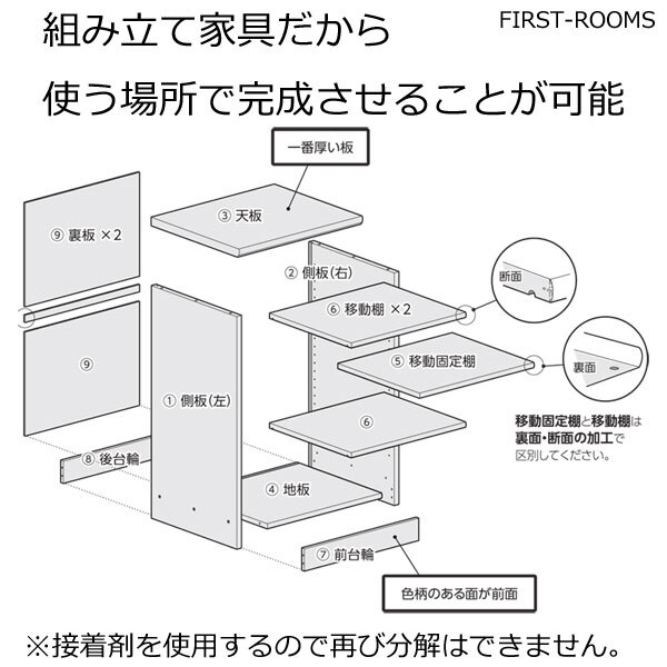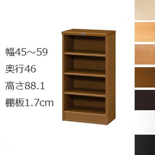 オーダーメイド、本棚です。高さ49・60・70・80・88・117・135・150・178・211cm、奥行きは19・25・31・40・46cm、カラーは12色。【本体外寸】幅45~59×奥行き46×高さ88.1cm(約)【棚板枚数】3枚【幅の内寸】全体の幅サイズから3.6cmを引いた寸法となります。※側板(縦の両脇の板)の厚みは1.7cm棚は移動可能で穴から穴までの高さ(ピッチ)は3cm【色・主材】12色・プリント紙化粧繊維板【生産国 】JAPAN※お客様組み立て商品です。(組み立て家具です)【お詫び】特注のため、お届けまで10~14日かかります。送料込ですが、北海道・沖縄・離島は別途送料がかかります。【井崎店長から一言】特別注文のため、ご注文後のサイズの変更、お取り消しがお受けすることが出来ません。サイズの確認を十分にお願いいたします。【お支払い方法について】>申し訳ございませんが、代金引換以外をお選びください。プラス・マイナスドライバーで組み立てられます。