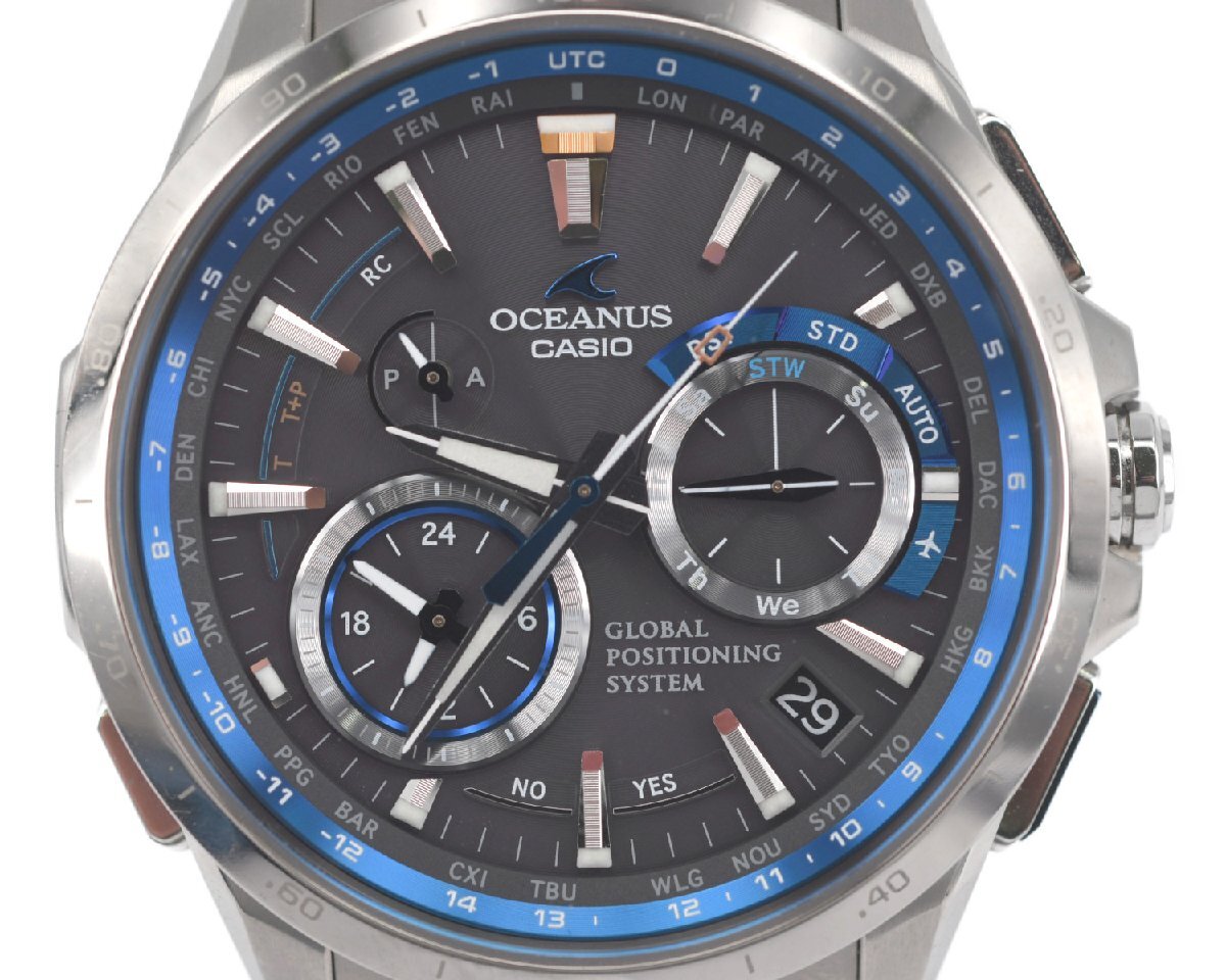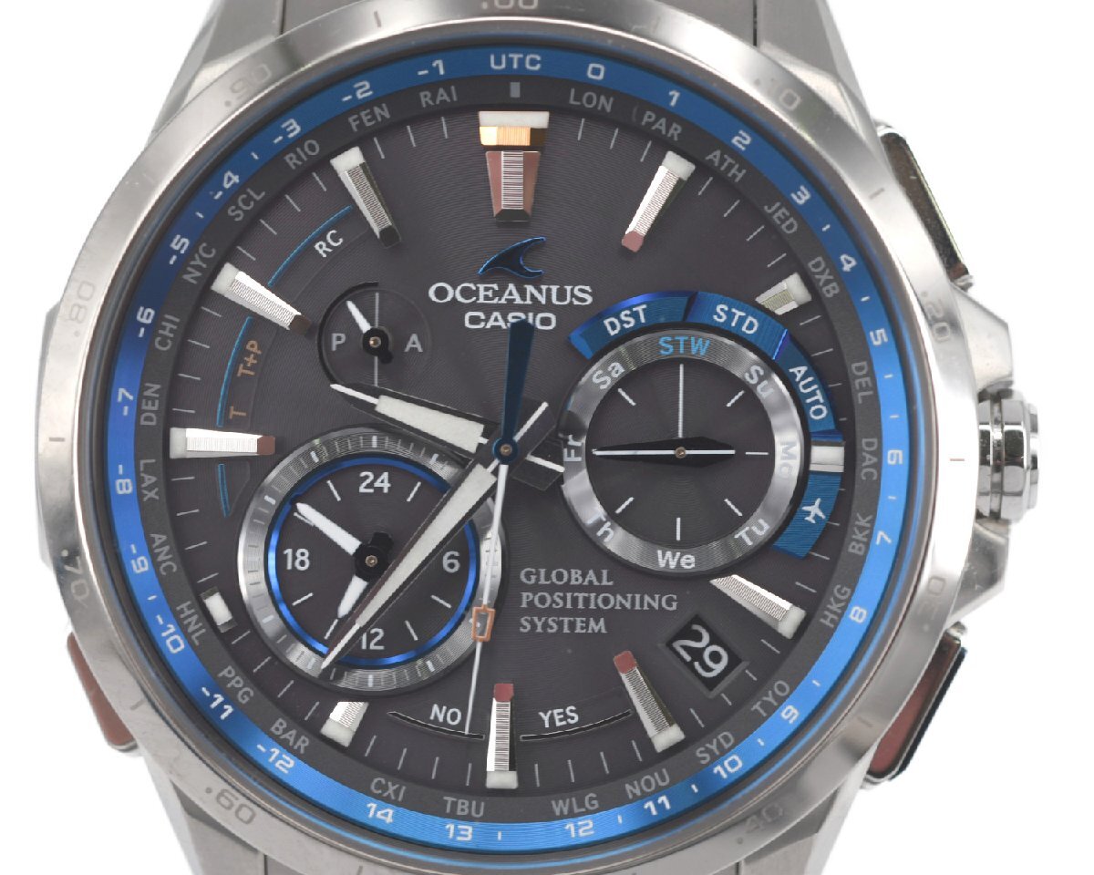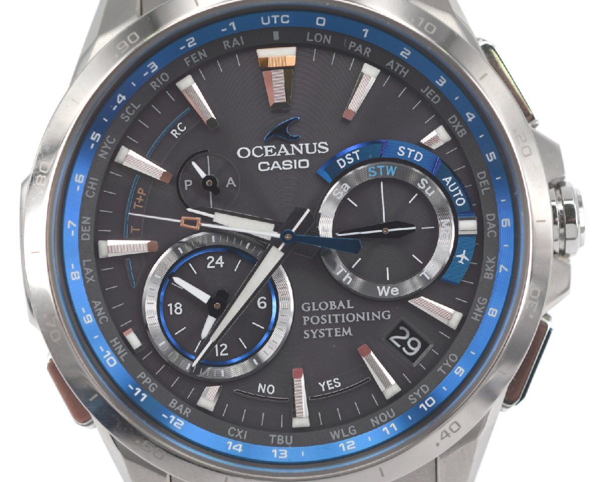 ナナハチヤは掘り出し物がいっぱいあります!! [美品] 稼働品【CASIO】カシオ オシアナス フルメタル GPS OCW-G1000-1AJF ハイブリット電波ソーラー 動作OK 中古品 定価22万 箱 保証書付のご案内です。 コンディションといたしましては、全体的にきれいな中古商品でございます。 オシャレなアイテムとして活躍する逸品です 稼働品で、動作OKでございます。 時刻も合っております。 もちろん機能性も抜群です。 チタン製で軽く、クロノグラフなど機能など申し分はございません。 大活躍する逸品です。 普段使いとして最適な商品です。 ぜひ、ご検討くださいませ。 ■製品説明 世界初(※1)フルメタルGPSハイブリッド電波ソーラー 2004年11月、オシアナスは“Elegance, Technology”をブランドコンセプトに、世界で初めてフルメタル電波ソーラークロノグラフというジャンルを切り開きました。そして10年経ったこの2014年、GPSハイブリッド電波ソーラー(※2)へと進化します。それはオシアナスが世界のどこに行っても正確な時刻を刻むという世界規模の信頼性を得たフルメタルクロノグラフへと進化したことを意味します。 GPSハイブリッド電波ソーラーシステムは正確な時刻を安定的に取得できるシステムです。今までオシアナスが培った電波ソーラーの利便性はそのままに、GPSからの位置受信でタイムゾーンを特定。サマータイムの有無も判別し、世界中のどこの都市に行っても正確な時刻を指し示します。ハイブリッドとしたことでGPS電波が入りにくい建物の中で標準電波を受信したり、標準電波インフラの無い地域でGPS電波を受信したりと、それぞれのメリットを活かし安定的に正確な時刻を取得することができるようになりました。また、見やすく使いやすいデュアルダイアルワールドタイム表示を採用。2都市の正確な時刻を一目で把握することができます。 デザインもGPSハイブリッド電波ソーラーモデルとしてこだわりました。12時の二体構造のインデックスと秒針の形状は衛星をイメージしデザイン。4時側のサイドボタンは、GPS機能ボタンとすぐにわかるように二体構造のツートーンにして目立つようになっています。都市コードリングやインデックス、インダイアルにスパッタリング(※3)という着色手法を施し、美しいブルーを発色。両面無反射コーティングが施され99%の透明度を誇るデュアルカーブサファイアガラス、平滑度の高いザラツ研磨、傷を付きにくくするチタンカーバイト処理が採用されオシアナスの最上級の仕上げを施しています。 海外出張や海外旅行でどこの国に行っても信頼できるエレガントな高機能クロノグラフが誕生しました。 ・ 世界初フルメタルGPS ハイブリッド電波ソーラー:世界6局の標準電波受信機能と、GPS 衛星からの時刻・位置情報の受信機能、サマータイム自動設定で世界中の正しい時刻表示を、タフソーラーによる安定的な駆動で実現 ・ 2都市の時刻を同時表示できるデュアルダイアルワールドタイム ・ ワールドタイム(27都市40タイムゾーン) ・ 針位置自動補正機能 ・ スマートアクセス ・ 1/20秒ストップウオッチ ・ 「ザラツ研磨」による平滑度の高い面仕上げ ・ 透明度99%を誇る両面無反射コーティングデュアルカーブサファイアガラス ・ チタンカーバイト処理 ※1 2014年8月時点、当社調べ ※2 「GPSハイブリッド電波ソーラー」 カシオ独自のソーラー充電システムで駆動し、GPS(Global Positioning System:汎世界測位(全地球航空測位)システム)による位置の測定または電波により時刻を修正する機能です。 ※3「スパッタリング」 薄膜の着色手法。多層膜のスペクトル制御により、透明感のある発色を実現。 ■ OCEANUS(オシアナス): 海を支配する神(ギリシャ神名:オケアノス)に由来。 ■製品仕様 ケース・ベゼル材質: チタン |