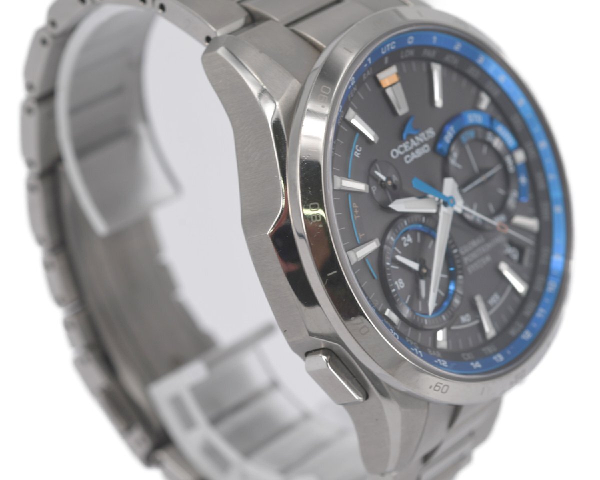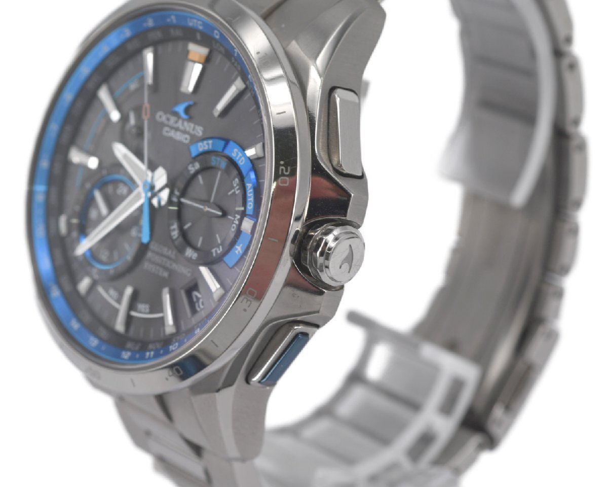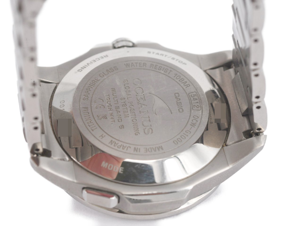 ナナハチヤは掘り出し物がいっぱいあります!! [美品] 稼働品【CASIO】カシオ オシアナス フルメタル GPS OCW-G1000-1AJF ハイブリット電波ソーラー 動作OK 中古品 定価22万 箱 保証書付のご案内です。 コンディションといたしましては、全体的にきれいな中古商品でございます。 オシャレなアイテムとして活躍する逸品です 稼働品で、動作OKでございます。 時刻も合っております。 もちろん機能性も抜群です。 チタン製で軽く、クロノグラフなど機能など申し分はございません。 大活躍する逸品です。 普段使いとして最適な商品です。 ぜひ、ご検討くださいませ。 ■製品説明 世界初(※1)フルメタルGPSハイブリッド電波ソーラー 2004年11月、オシアナスは“Elegance, Technology”をブランドコンセプトに、世界で初めてフルメタル電波ソーラークロノグラフというジャンルを切り開きました。そして10年経ったこの2014年、GPSハイブリッド電波ソーラー(※2)へと進化します。それはオシアナスが世界のどこに行っても正確な時刻を刻むという世界規模の信頼性を得たフルメタルクロノグラフへと進化したことを意味します。 GPSハイブリッド電波ソーラーシステムは正確な時刻を安定的に取得できるシステムです。今までオシアナスが培った電波ソーラーの利便性はそのままに、GPSからの位置受信でタイムゾーンを特定。サマータイムの有無も判別し、世界中のどこの都市に行っても正確な時刻を指し示します。ハイブリッドとしたことでGPS電波が入りにくい建物の中で標準電波を受信したり、標準電波インフラの無い地域でGPS電波を受信したりと、それぞれのメリットを活かし安定的に正確な時刻を取得することができるようになりました。また、見やすく使いやすいデュアルダイアルワールドタイム表示を採用。2都市の正確な時刻を一目で把握することができます。 デザインもGPSハイブリッド電波ソーラーモデルとしてこだわりました。12時の二体構造のインデックスと秒針の形状は衛星をイメージしデザイン。4時側のサイドボタンは、GPS機能ボタンとすぐにわかるように二体構造のツートーンにして目立つようになっています。都市コードリングやインデックス、インダイアルにスパッタリング(※3)という着色手法を施し、美しいブルーを発色。両面無反射コーティングが施され99%の透明度を誇るデュアルカーブサファイアガラス、平滑度の高いザラツ研磨、傷を付きにくくするチタンカーバイト処理が採用されオシアナスの最上級の仕上げを施しています。 海外出張や海外旅行でどこの国に行っても信頼できるエレガントな高機能クロノグラフが誕生しました。 ・ 世界初フルメタルGPS ハイブリッド電波ソーラー:世界6局の標準電波受信機能と、GPS 衛星からの時刻・位置情報の受信機能、サマータイム自動設定で世界中の正しい時刻表示を、タフソーラーによる安定的な駆動で実現 ・ 2都市の時刻を同時表示できるデュアルダイアルワールドタイム ・ ワールドタイム(27都市40タイムゾーン) ・ 針位置自動補正機能 ・ スマートアクセス ・ 1/20秒ストップウオッチ ・ 「ザラツ研磨」による平滑度の高い面仕上げ ・ 透明度99%を誇る両面無反射コーティングデュアルカーブサファイアガラス ・ チタンカーバイト処理 ※1 2014年8月時点、当社調べ ※2 「GPSハイブリッド電波ソーラー」 カシオ独自のソーラー充電システムで駆動し、GPS(Global Positioning System:汎世界測位(全地球航空測位)システム)による位置の測定または電波により時刻を修正する機能です。 ※3「スパッタリング」 薄膜の着色手法。多層膜のスペクトル制御により、透明感のある発色を実現。 ■ OCEANUS(オシアナス): 海を支配する神(ギリシャ神名:オケアノス)に由来。 ■製品仕様 ケース・ベゼル材質: チタン |