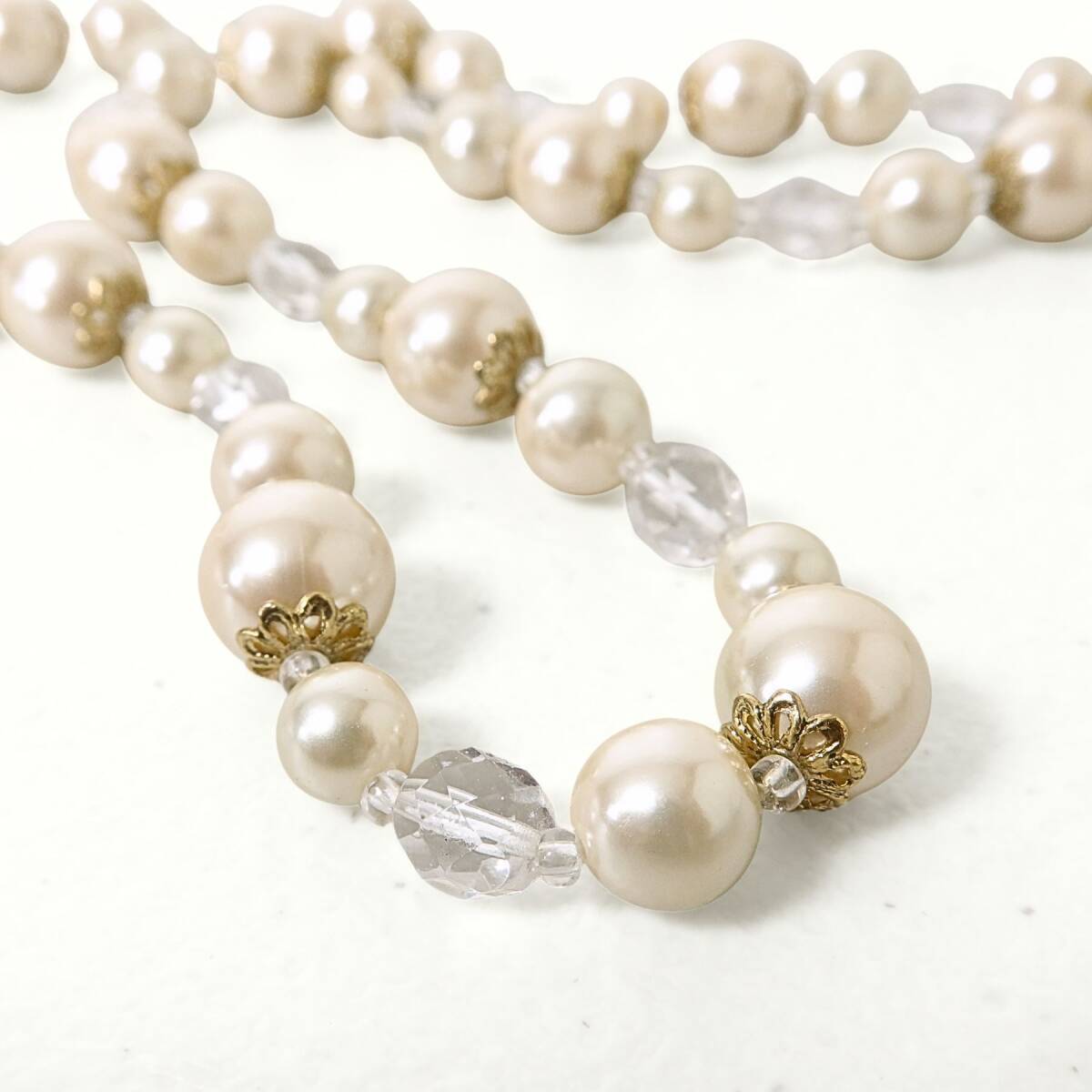 商品説明 | 【実寸約】全長:48 【状態】普通の使用感あるお品物~状態良好で美品の域に入るお品物 【デザイン】パールホワイト・クリア系 艶感パールと、光を受けてきらめくクリアビーズを組み合わせた上品なネックレス。 ゴールドの差し色が華やかさを添え、顔まわりを明るく引き立てます。 パーティーやフォーマルシーンにはもちろん、シンプルなコーデに合わせても大人の気品を演出。 一本でコーデが華やぐ素敵なネックレスです。 |