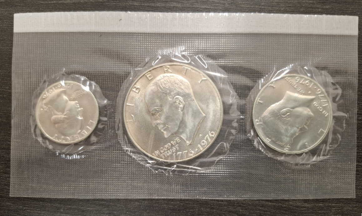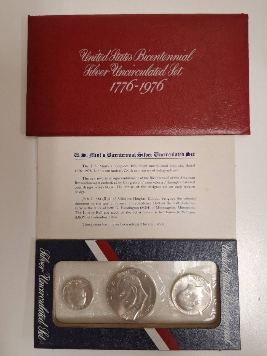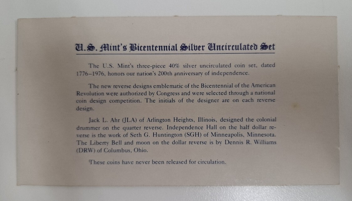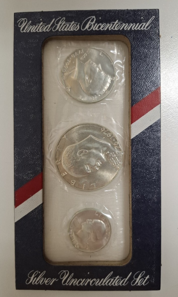 【貴重・未開封・説明書付】 アメリカ合衆国建国200周年記念 リバティ銀貨 3枚セット 1776-1976年 $1 C50 C25 記念硬貨 古銭 外国銭 ドル