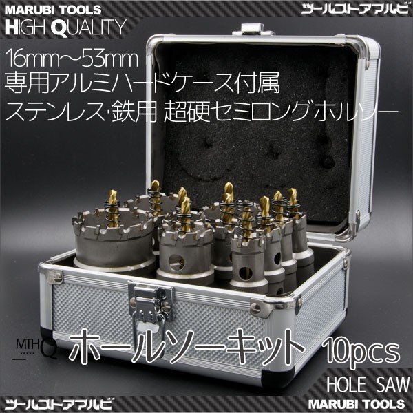 【送料無料】金属板などに穴を開け用 ホールソー10セット★ステンレス 鉄用 超硬セミロング HSS ハイス鋼 16~53mm 専用ケース付き 10pcs