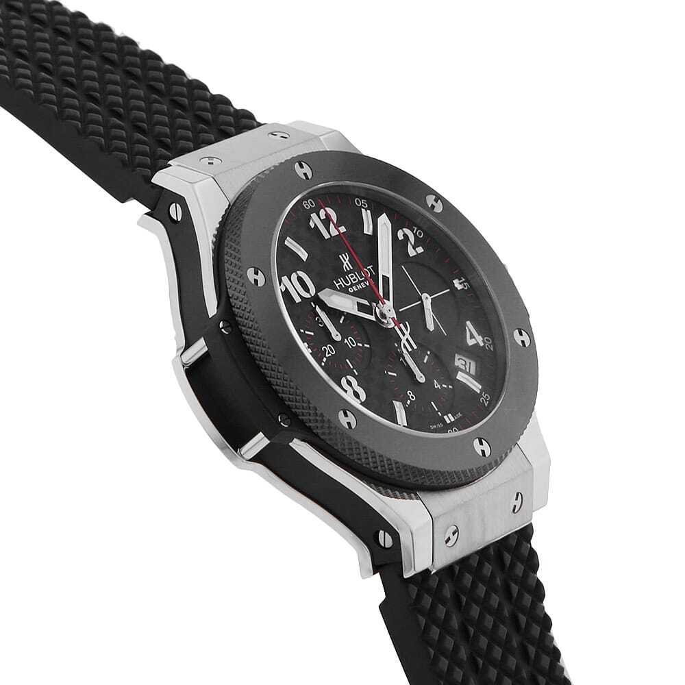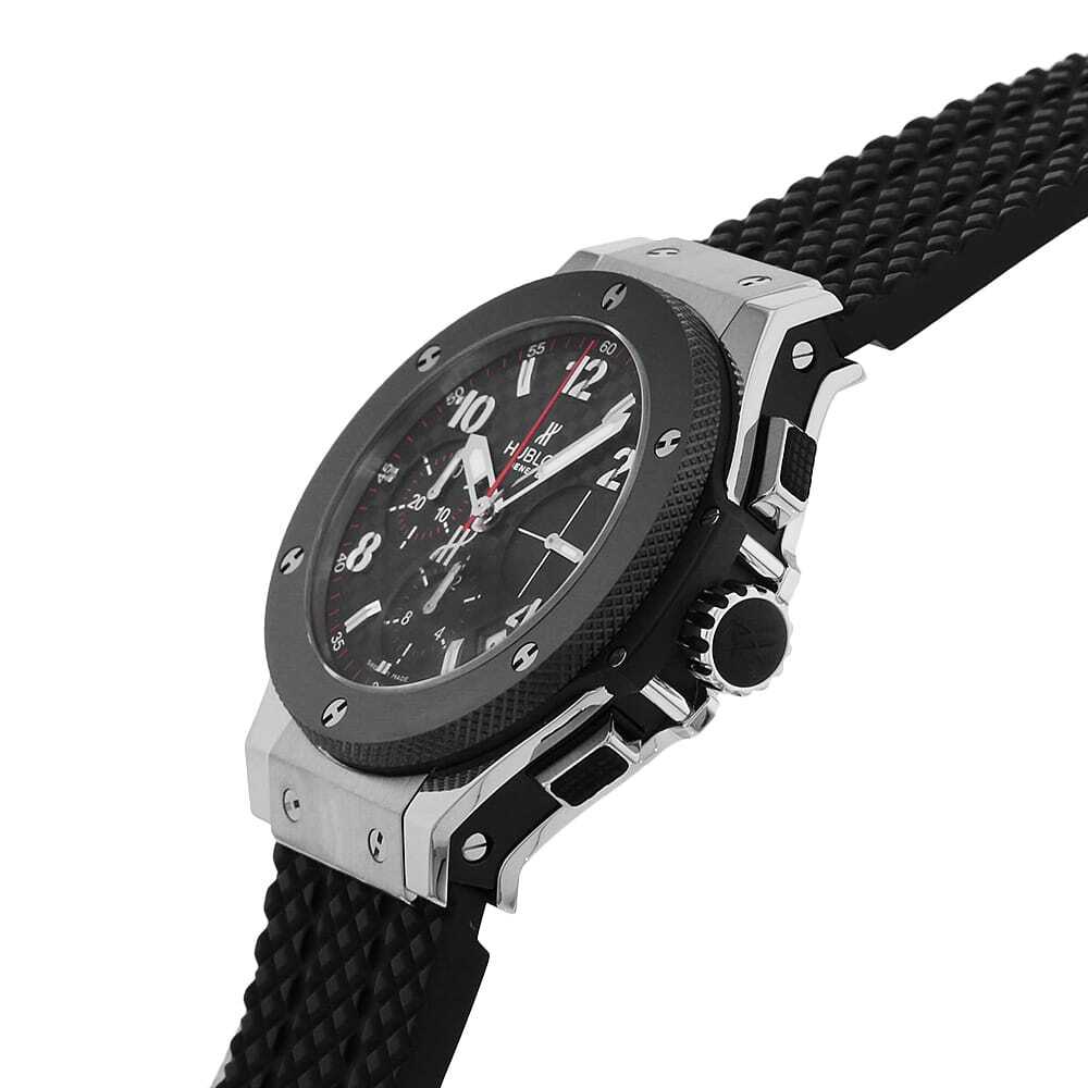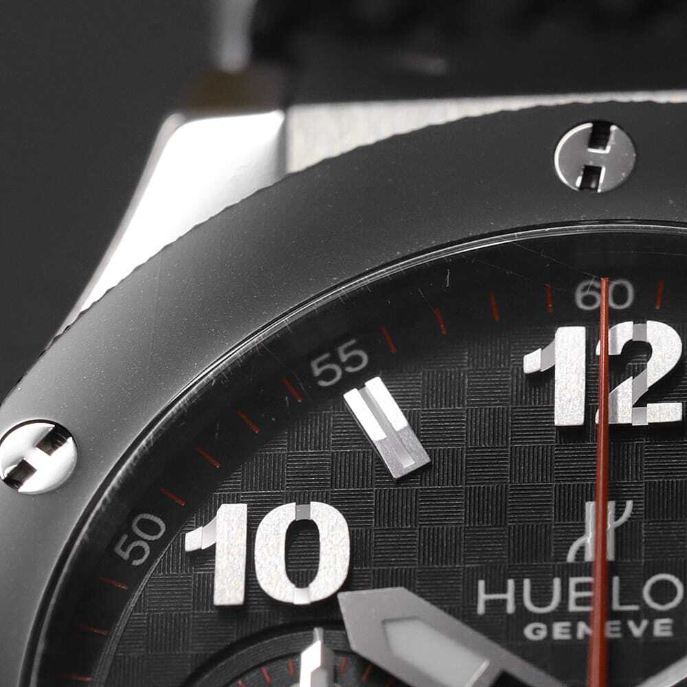| モデル情報 | 2005年の登場以来、その名の通り世界中で爆発的な人気を続けるビッグバン。こちらはステンレスのケースに、ブラックセラミックのベゼルを組み合わせたモデルです。クロノ秒針に指し色として使われた赤が力強い印象を与えています。 |
