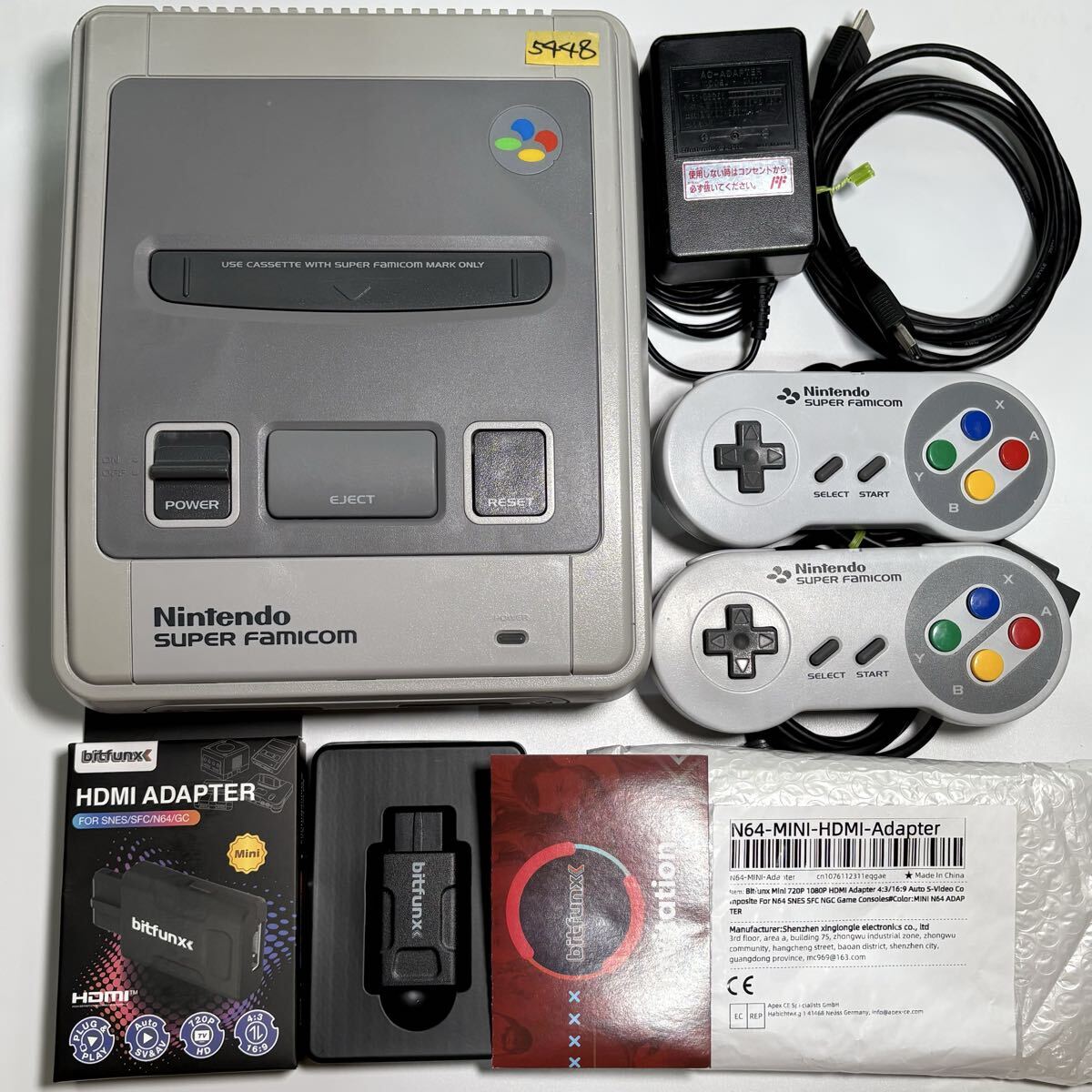 内容物はスーパーファミコン本体、コントローラー2個、電源アダプタ、HDMI変換アダプタ(新品)、HDMIケーブル【※ソフトは付属しません】